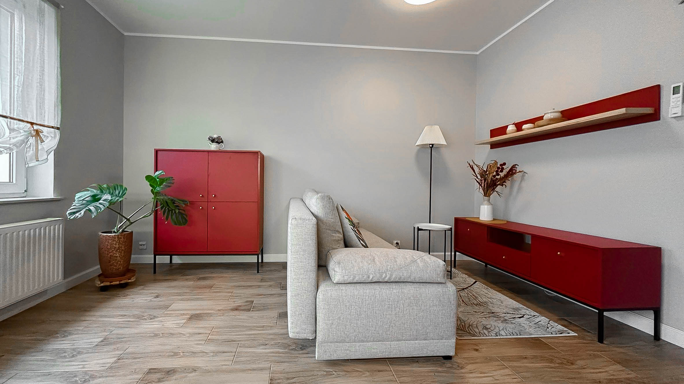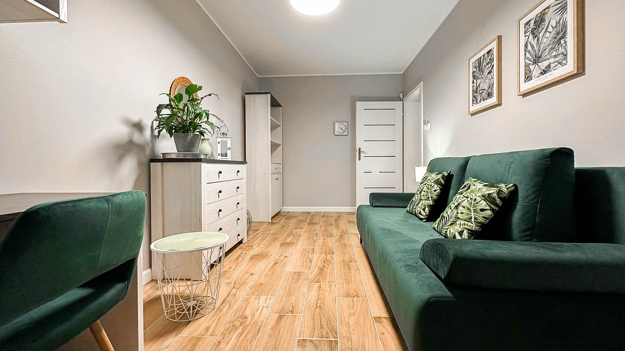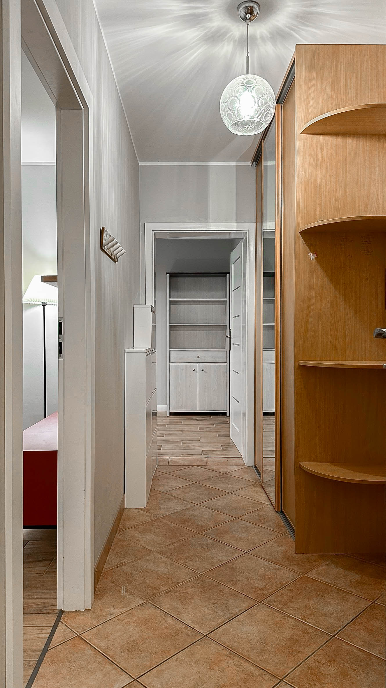 Mieszkanie jest utrzymane w jasnych barwach, całkowicie wyposażone w meble
