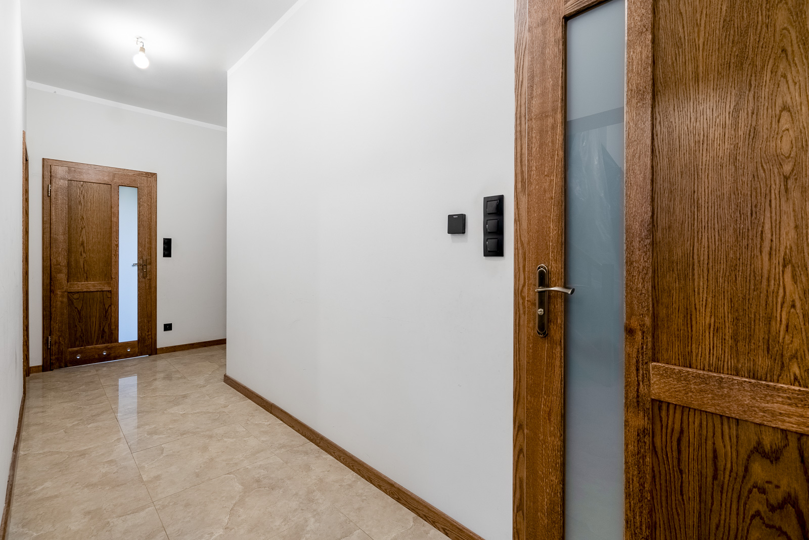 Materiały użyte do wykończenia są wysokiej jakości. Biegi schodowe między parterem, a piętrem wyłożone są drewnem, a na podłogach znajduje się wysokiej jakości jasno-popielaty gres oraz deska drewniana.