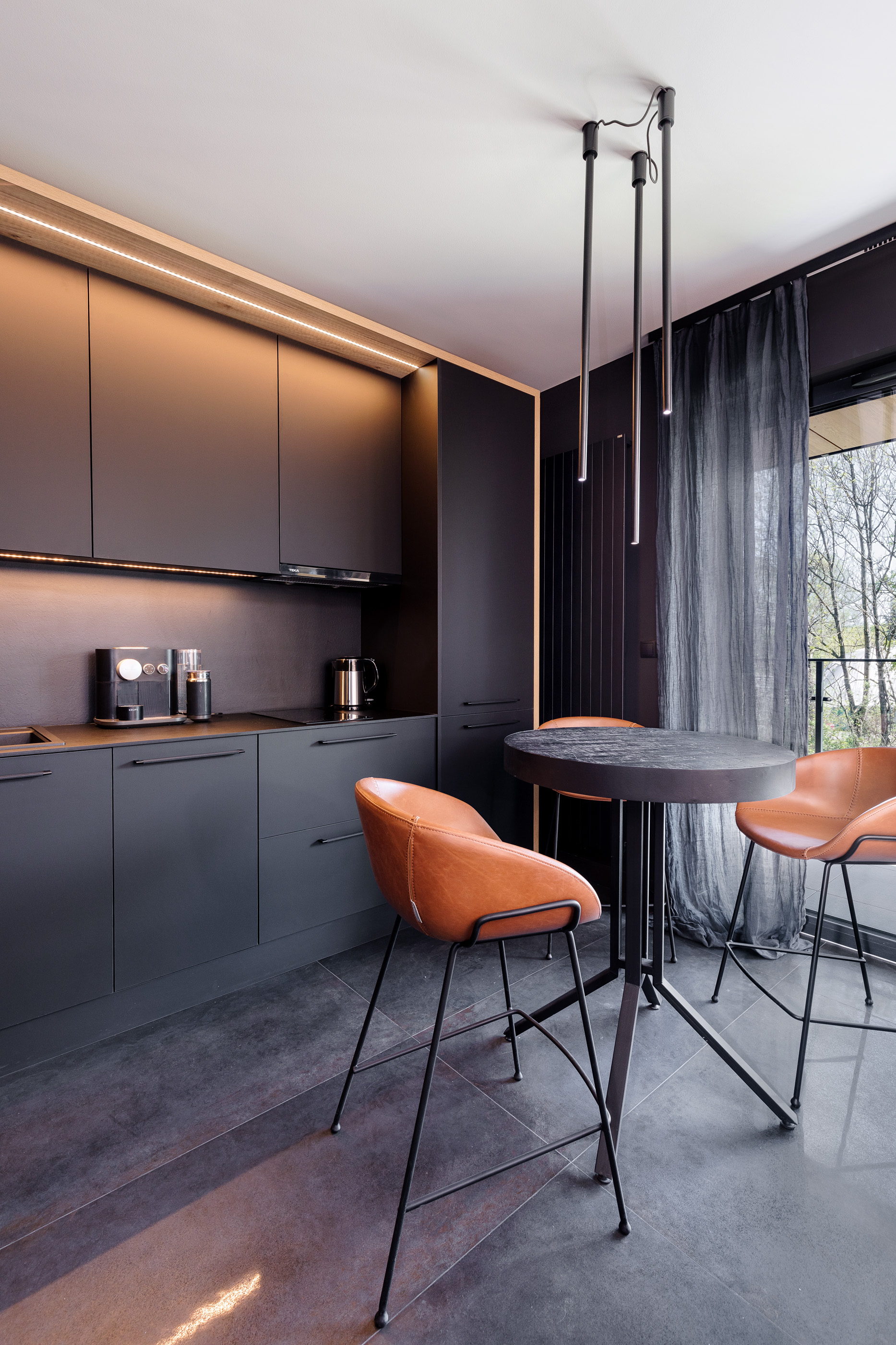 Ciemny styl kawalerki delikatnie przełamują rdzawe akcenty w postaci pasów na płytkach, tapicerki na krzesłach czy dywanu. Całość składa się na niezwykle eleganckie wnętrze.