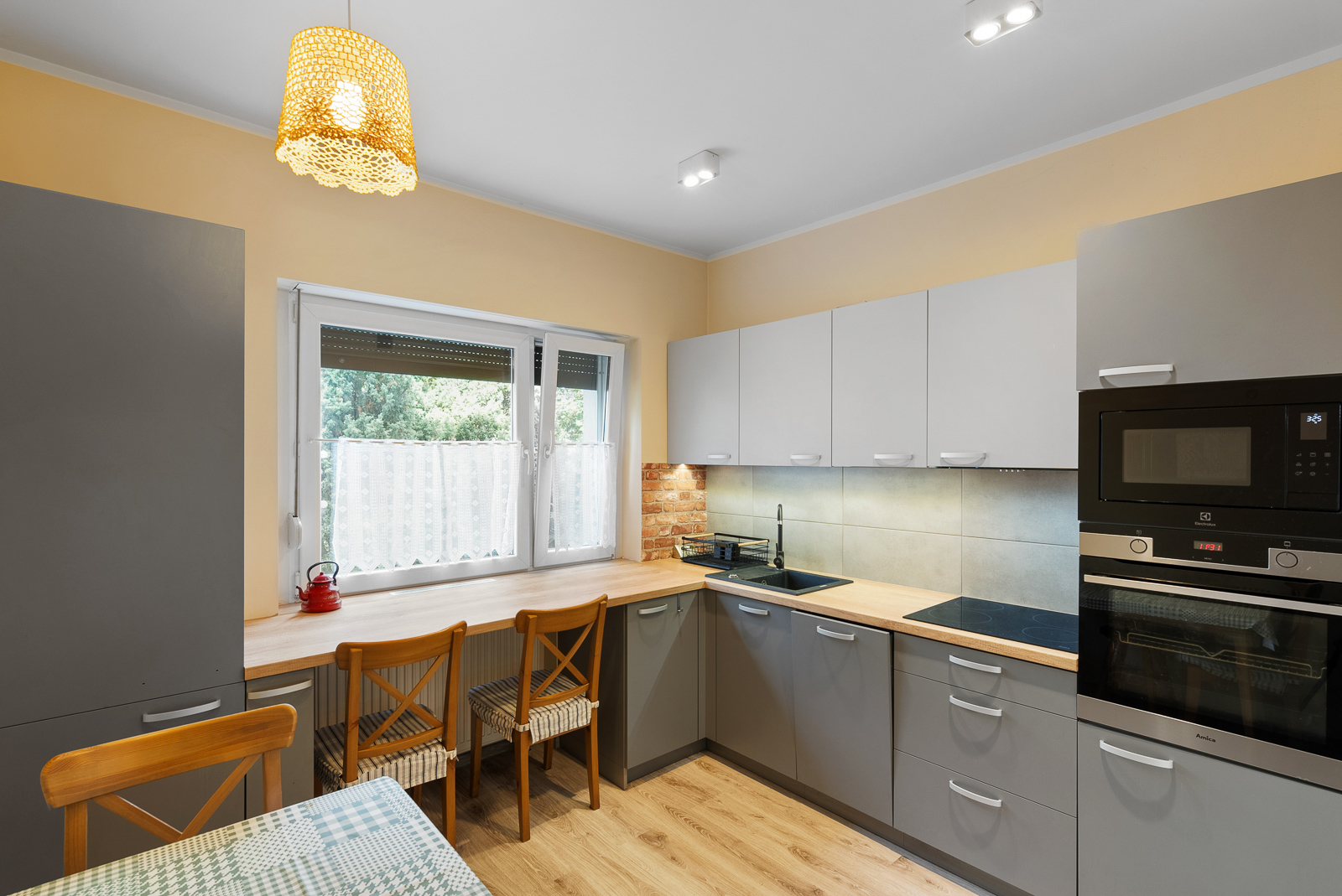Wykończenie wnętrz budynku różnorodne: lokal nr 1 - nowoczesne, standardowe, lokal nr 2 – do remontu. Na podłogach panele podłogowe, deski podłogowe oraz płyty ceramiczne. Stolarka drzwiowa płycinowa. Stolarka okienna energooszczędna z profili PCV, z dwoma oknami drewnianymi skrzynkowymi, rolety zewnętrzne.