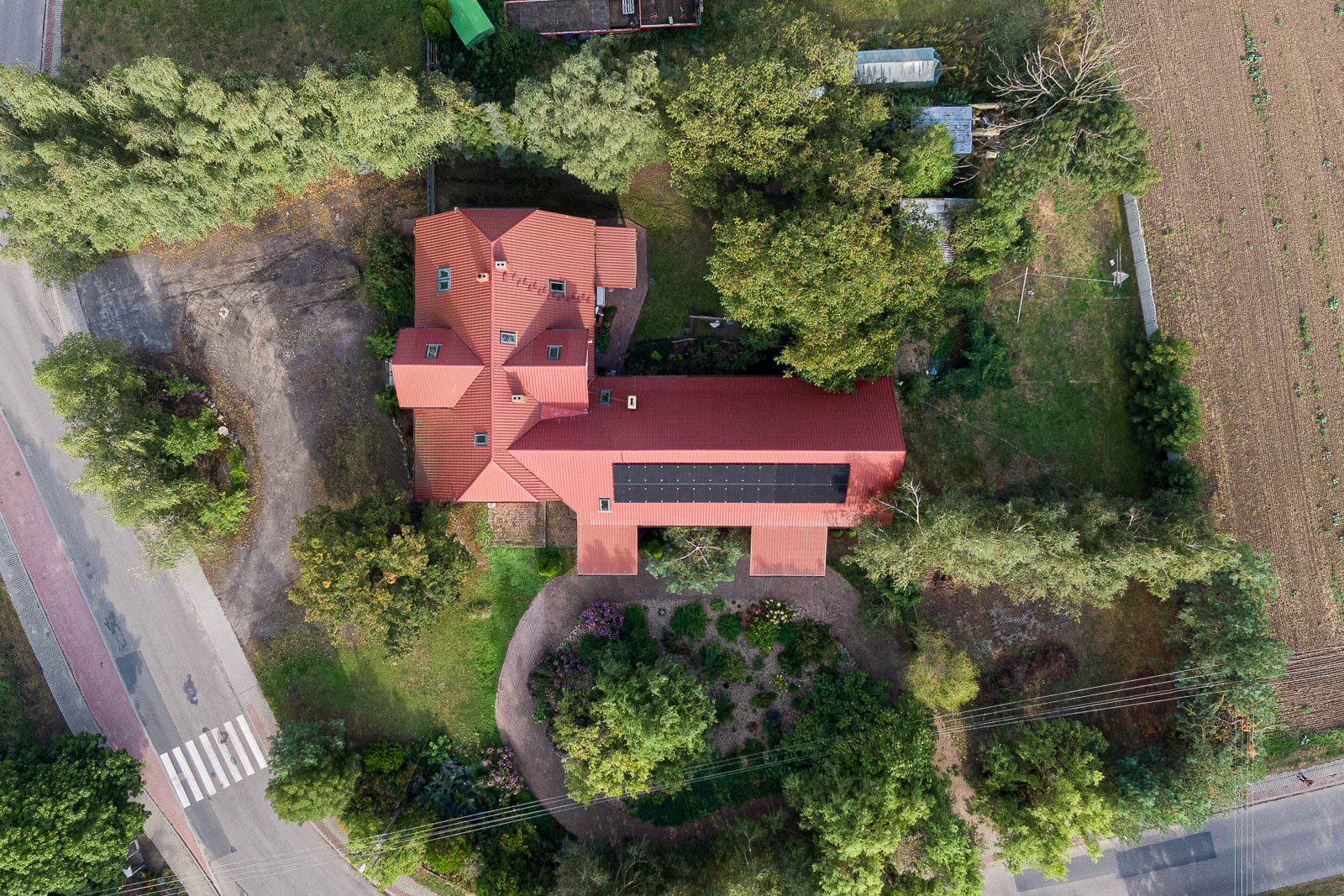 Działka narożnikowa o powierzchni 3.477 m2 zagospodarowana krzewami i drzewami ozdobnymi oraz drobną roślinnością ozdobną i brukowanymi ścieżkami.