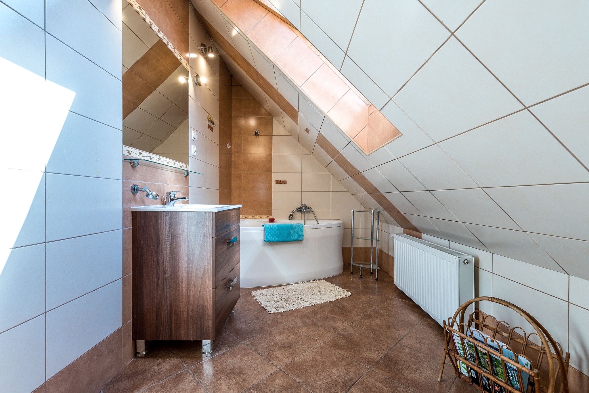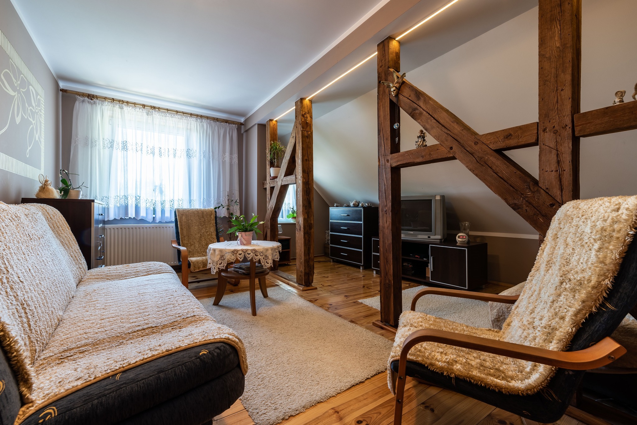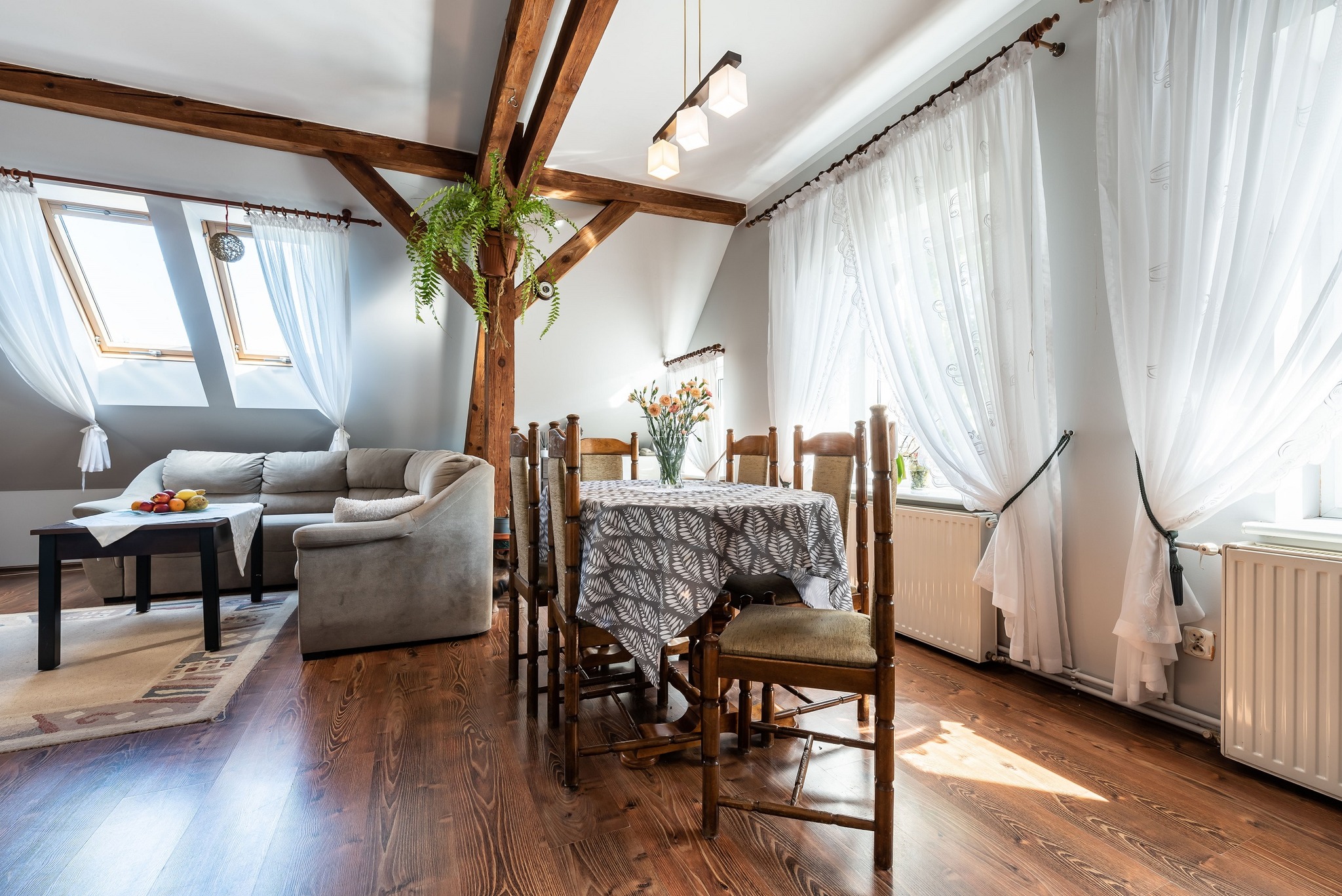 W mieszkaniu na piętrze oryginalne belki stropowe stanowiące bardzo ciekawą aranżację.