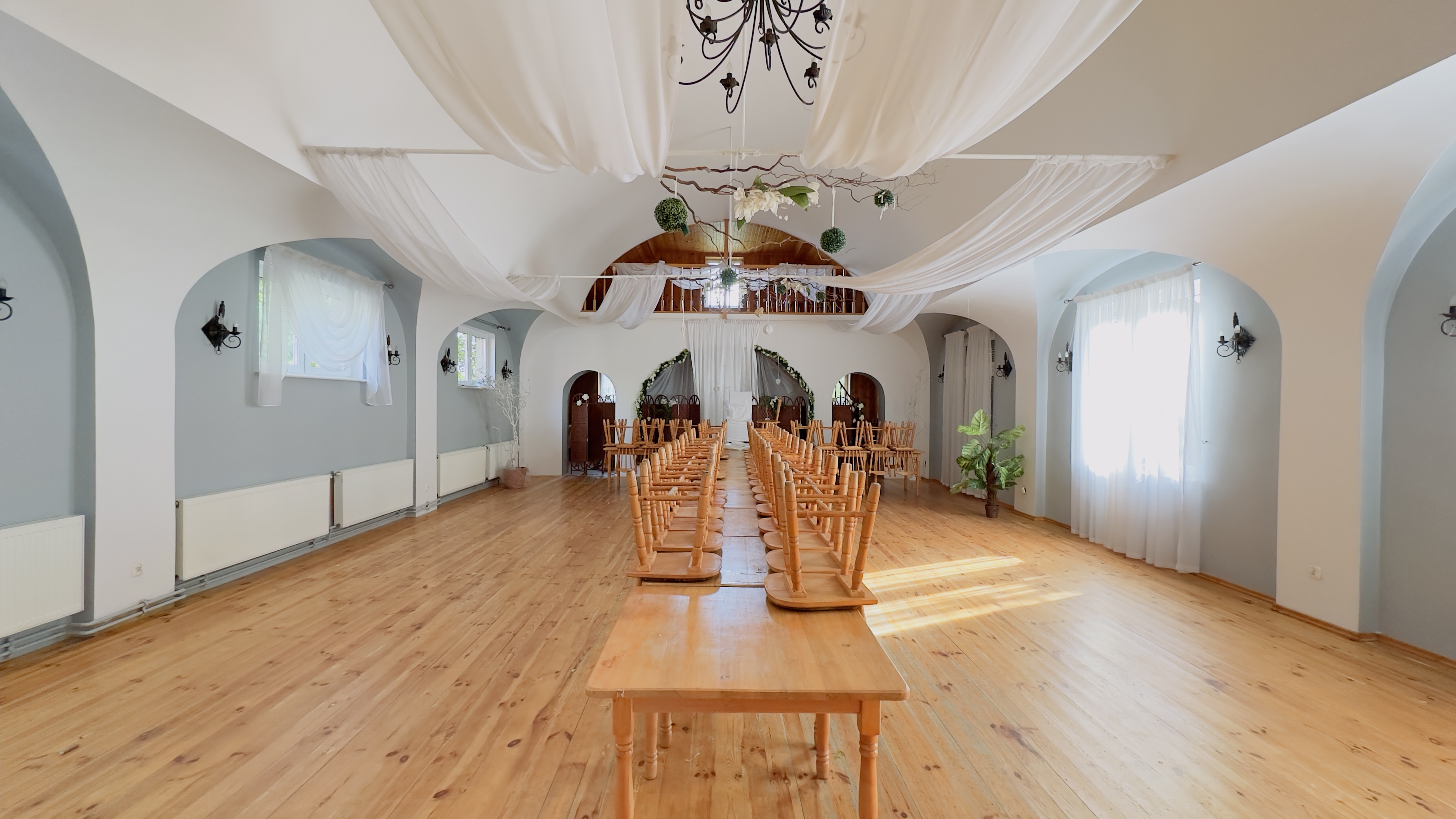 Dach skośny kryty dachówką. Budynki z cegły dziurawki, dom ocieplony styropianem. Charakterystyczne łuki oraz wysokie sklepienie w sali kominkowej/bankietowej.