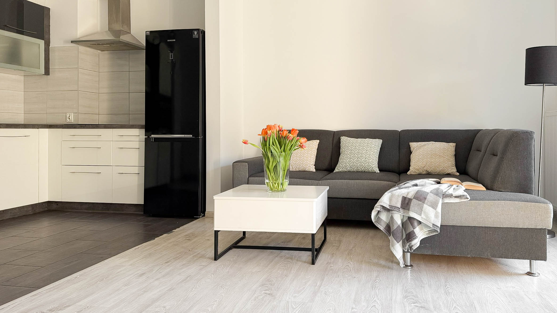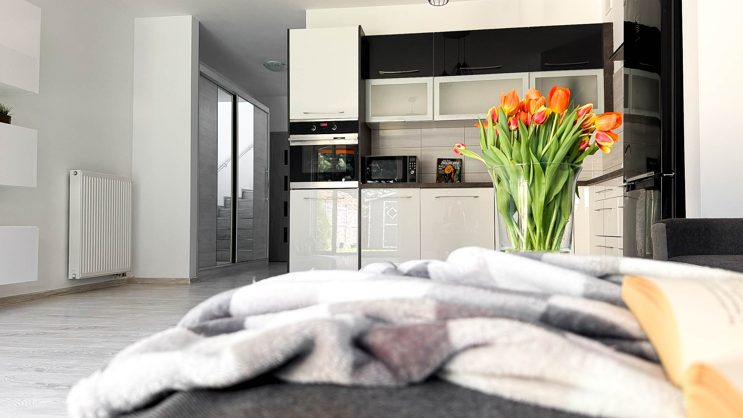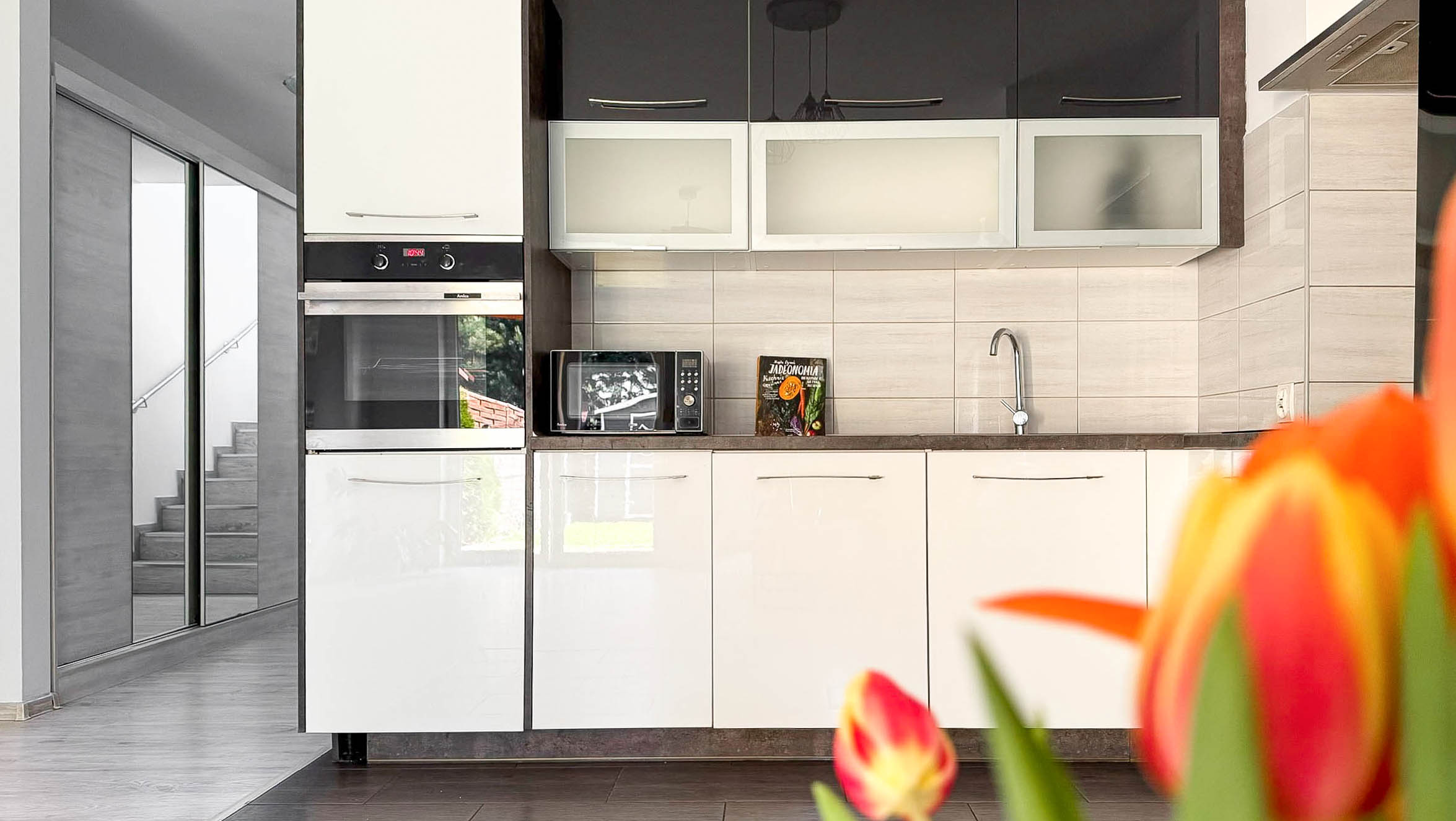 W salonie znajduje się rozkładany duży narożnik oraz szafki wiszące. Aneks kuchenny jest wyposażony w niezbędny sprzęt AGD (piekarnik, zmywarka, lodówka z zamrażarką, płyta indukcyjna). W korytarzu i wiatrołapie znajdują się duże szafy z zabudowie oraz dodatkowo pomieszczenie gospodarcze pod schodami.