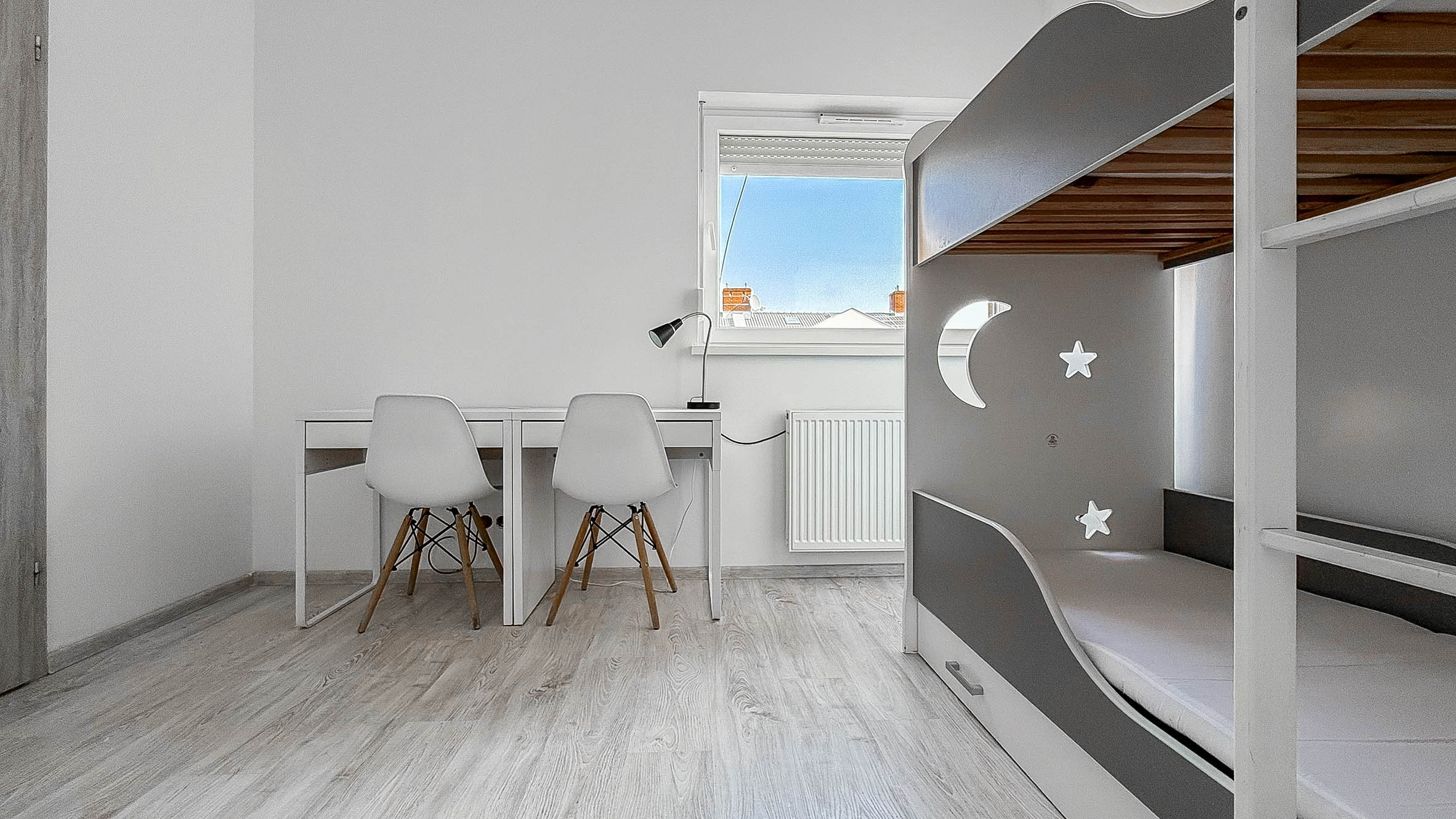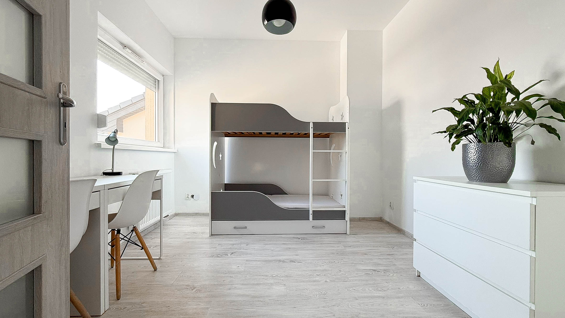 Sypialnia dziecięca wyposażona jest w łóżko piętrowe, komodę oraz dwa biurka z krzesłami.