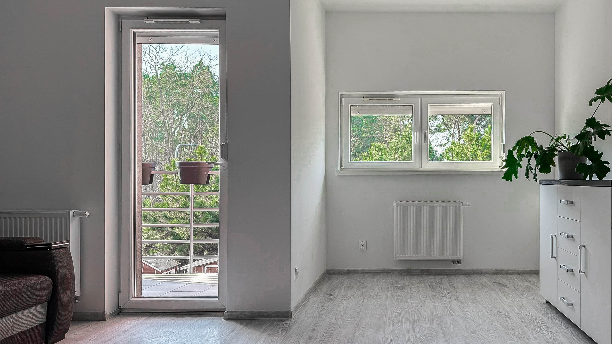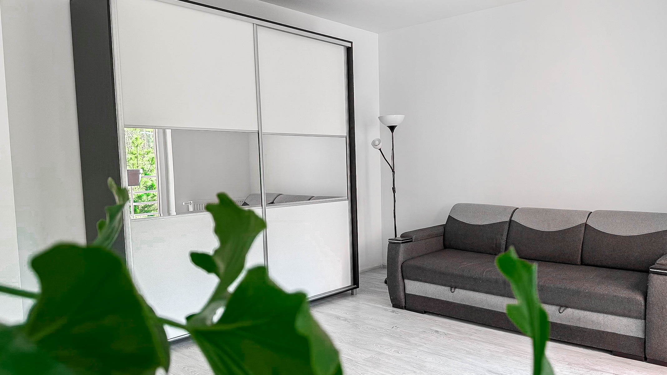 W sypialni z balkonem znajdują się komody, duża szafa w zabudowie oraz rozkładana kanapa.