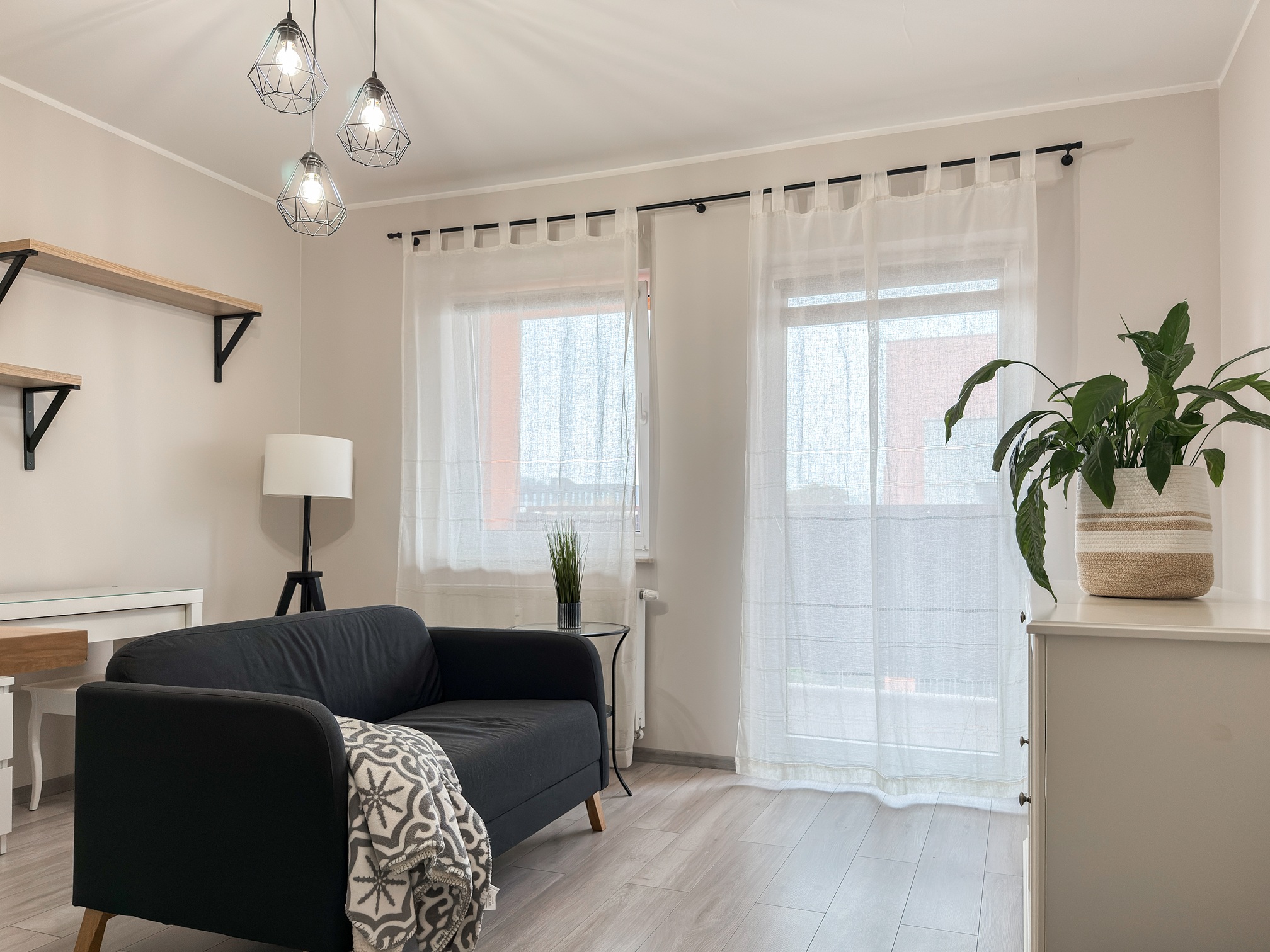 W salonie znajduje się kanapa nierozkładana kanapa, fotel, biurko do pracy, komódka.