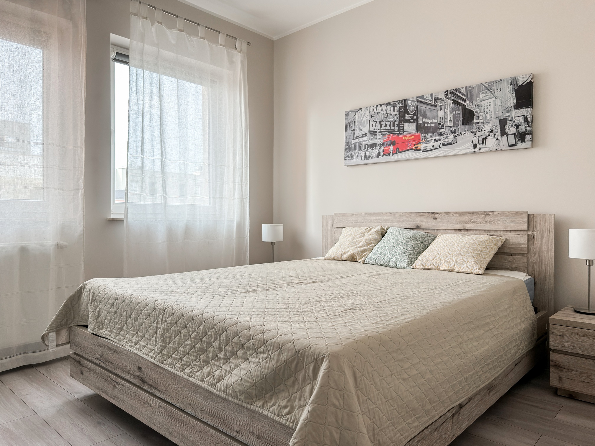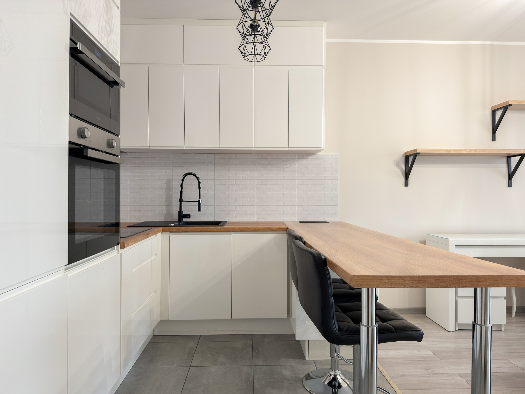 Mieszkanie jest pięknie i nowocześnie wyposażone. Wygodna kuchnia posiada duży blat roboczy, jest wyposażona w zmywarkę, lodówkę, piekarnik, mikrofalówkę i płytę indukcyjną.