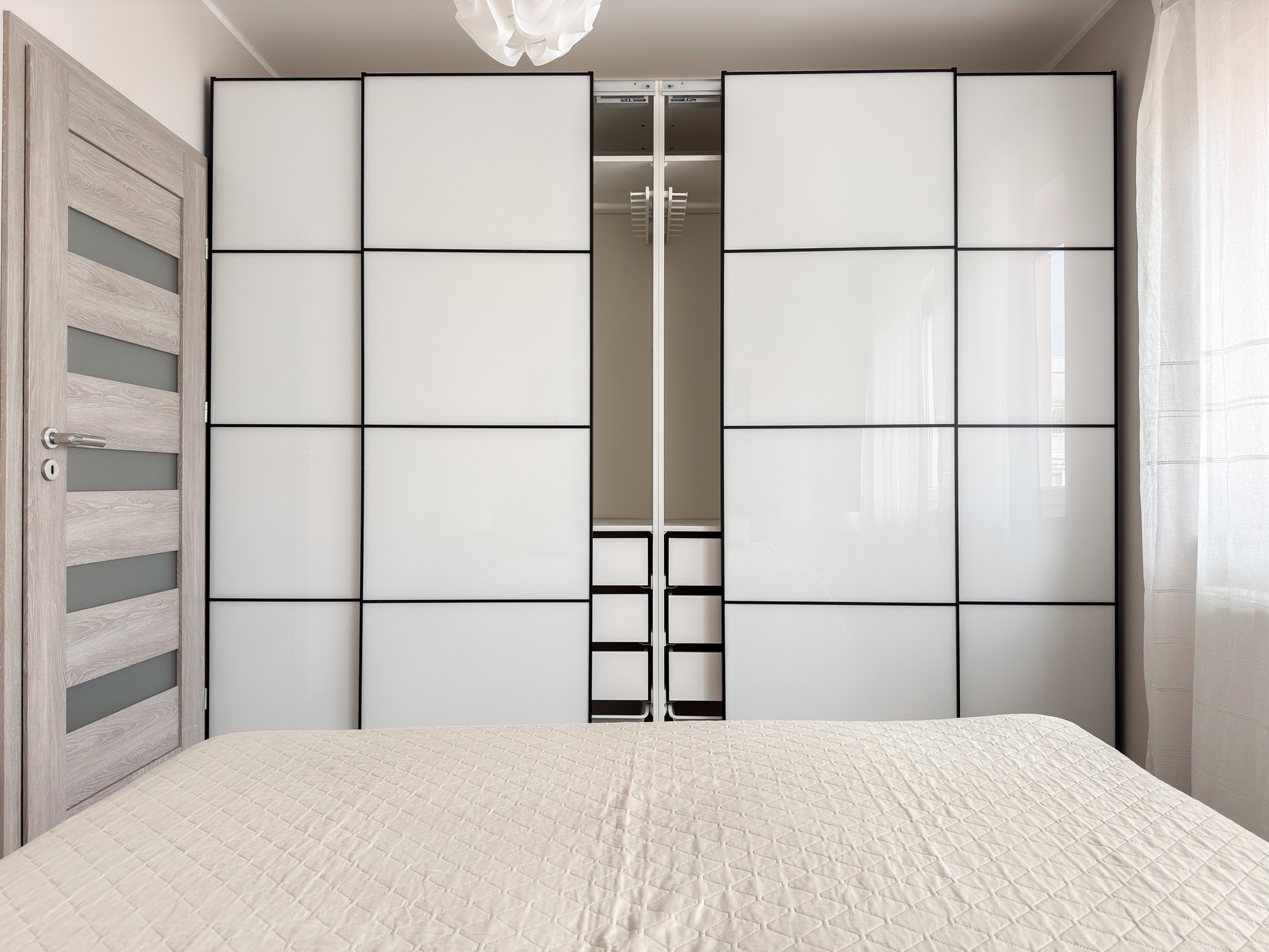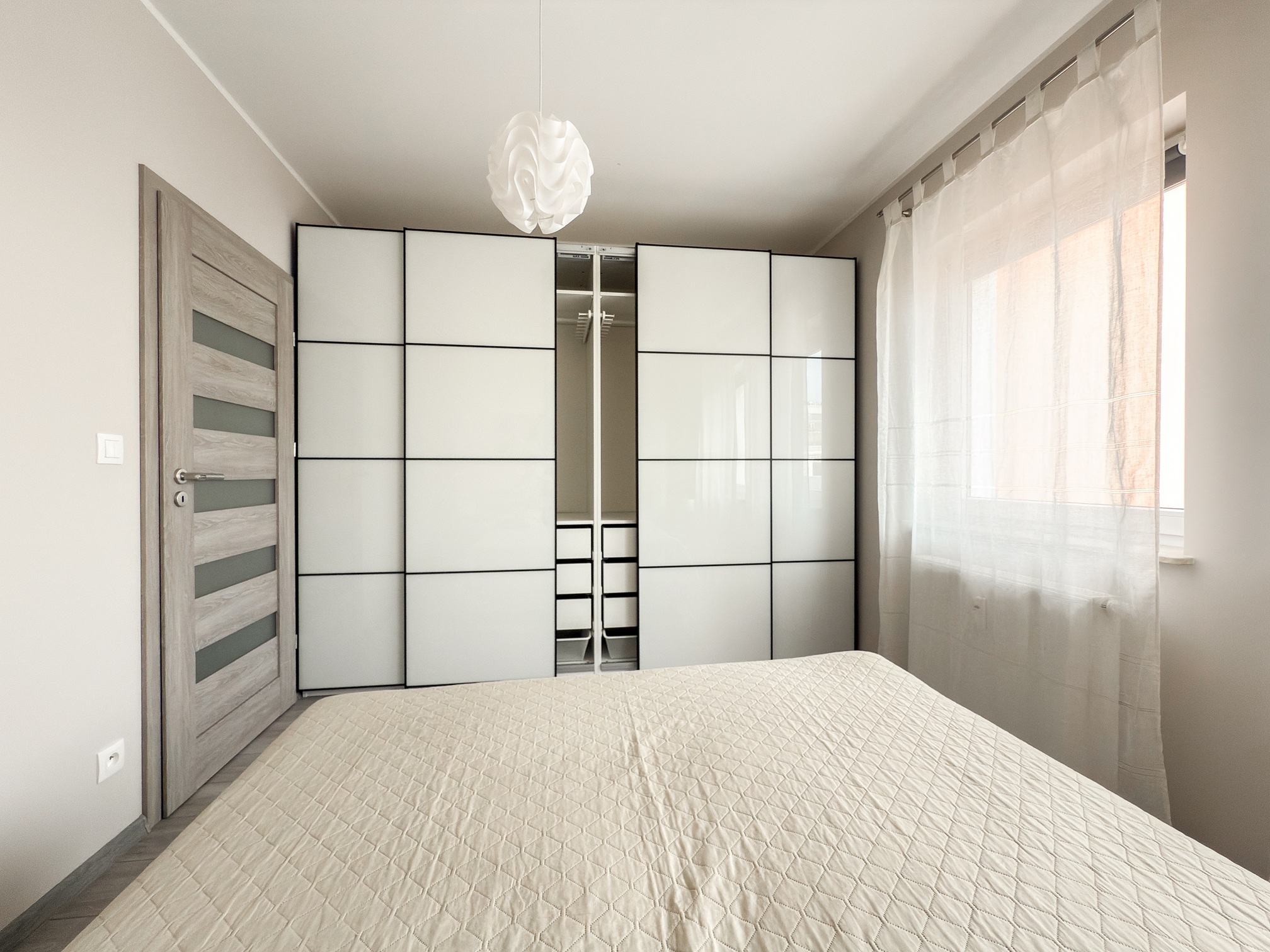 W sypialni znajduje się dwuosobowe łóżko oraz duża szafa w zabudowie.