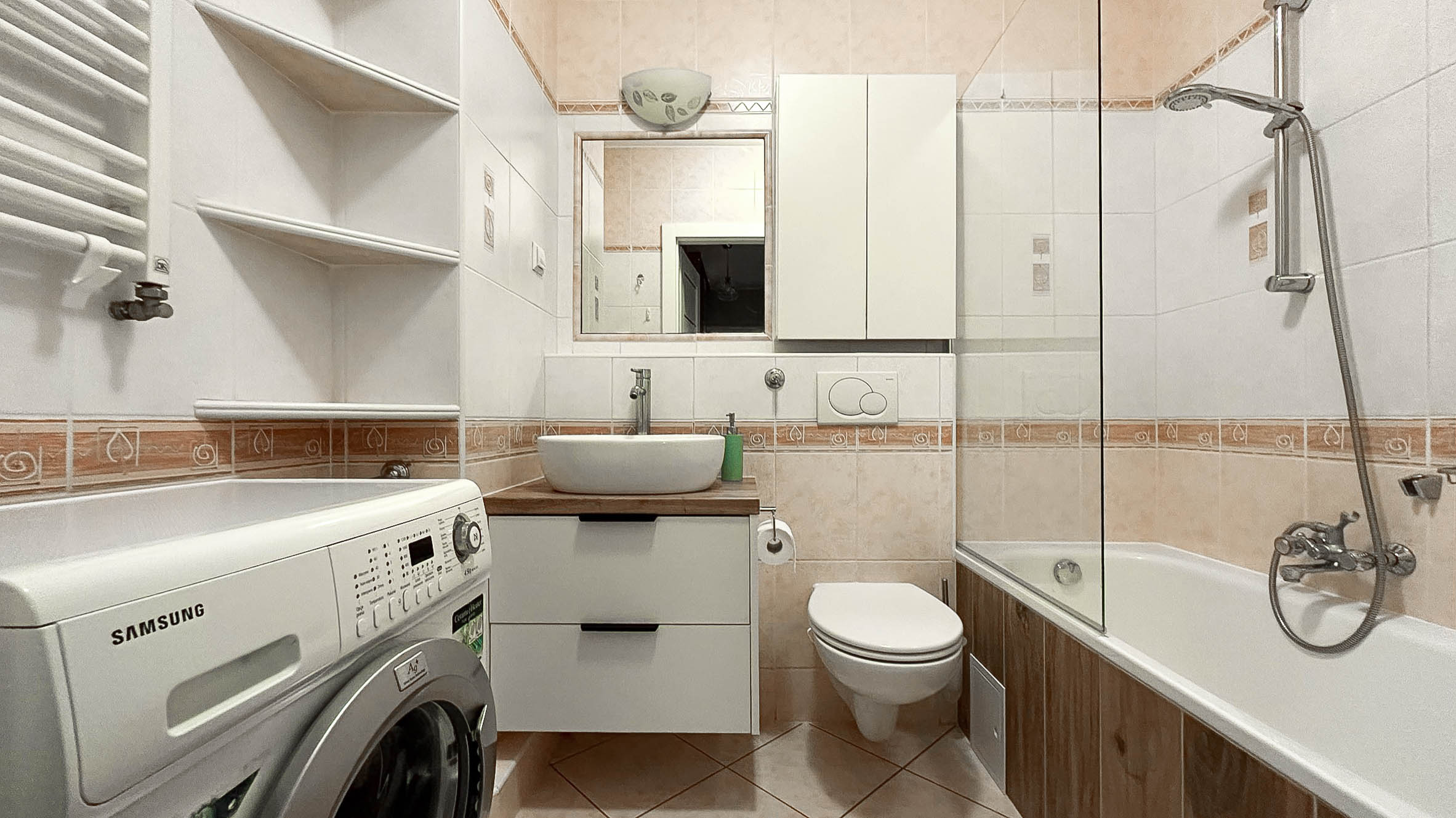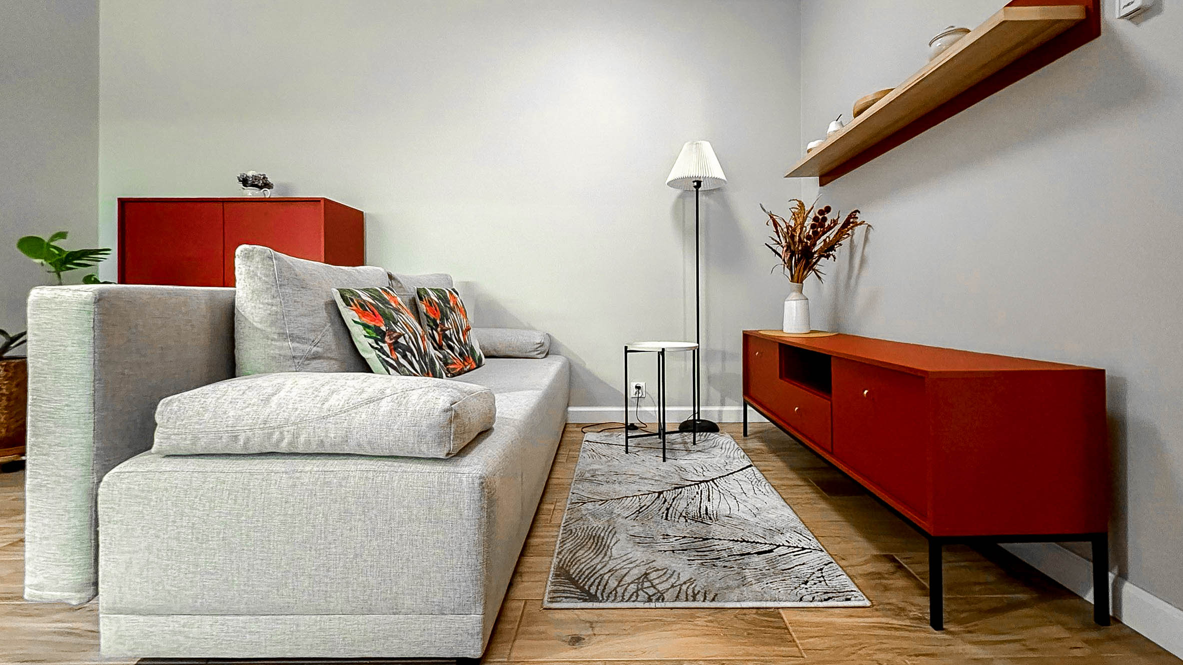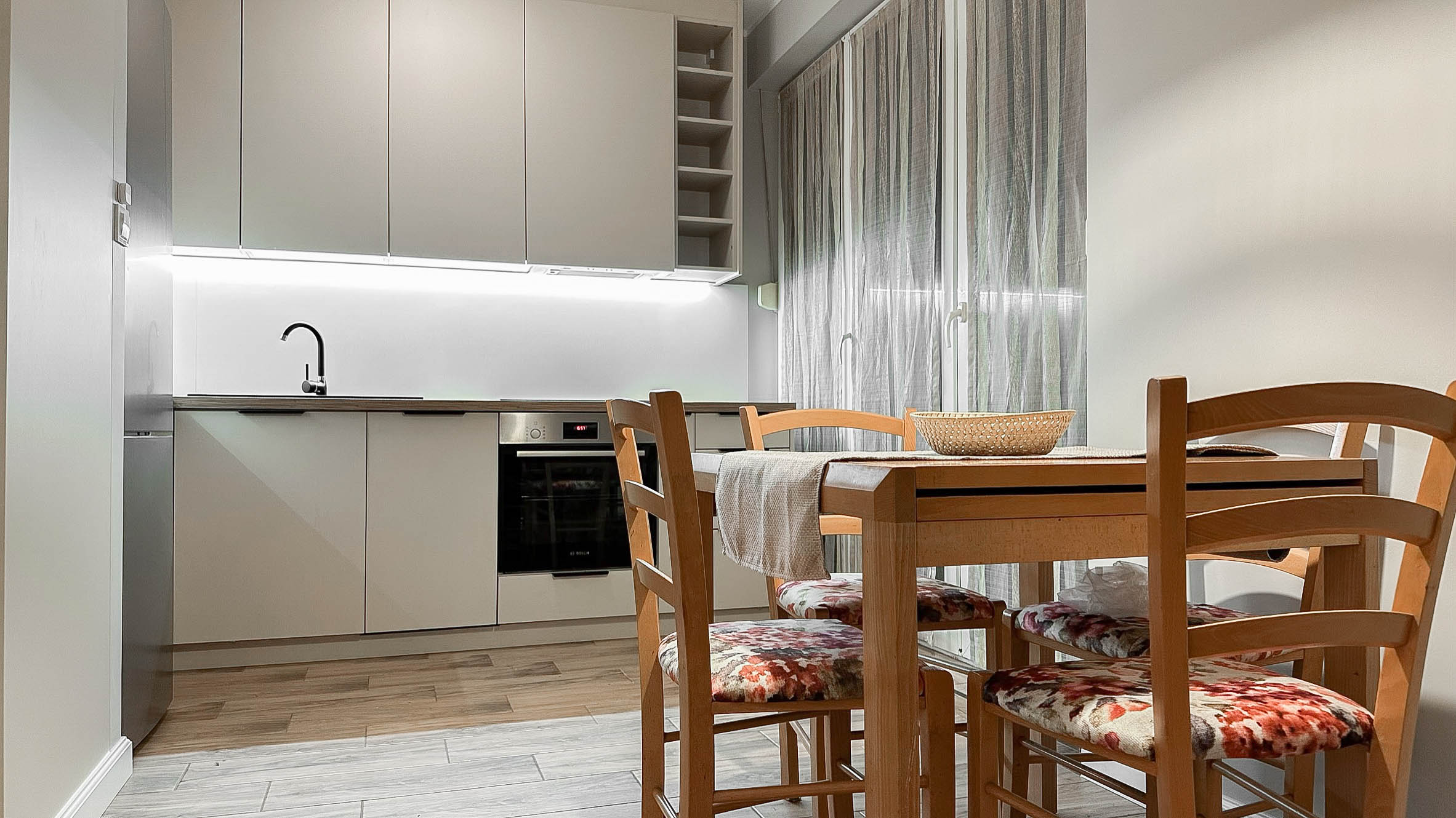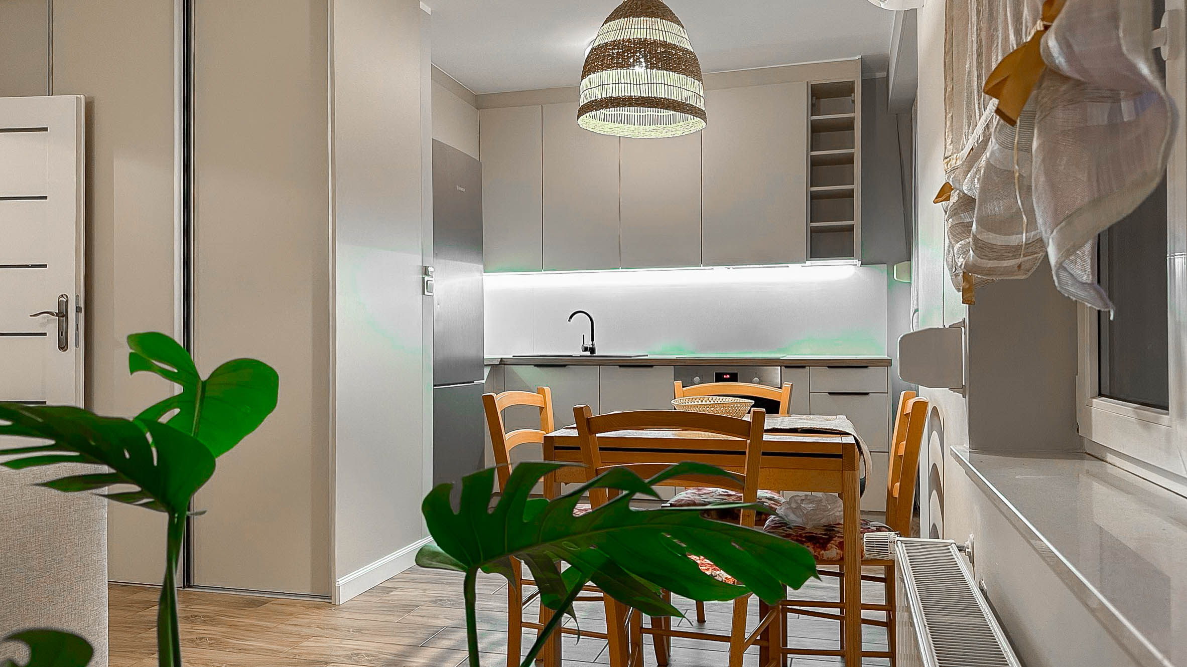 Mieszkanie jest utrzymane w jasnych barwach, całkowicie wyposażone w meble