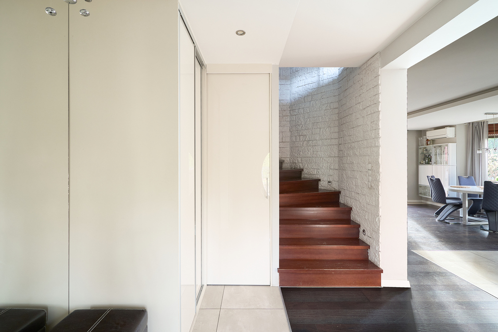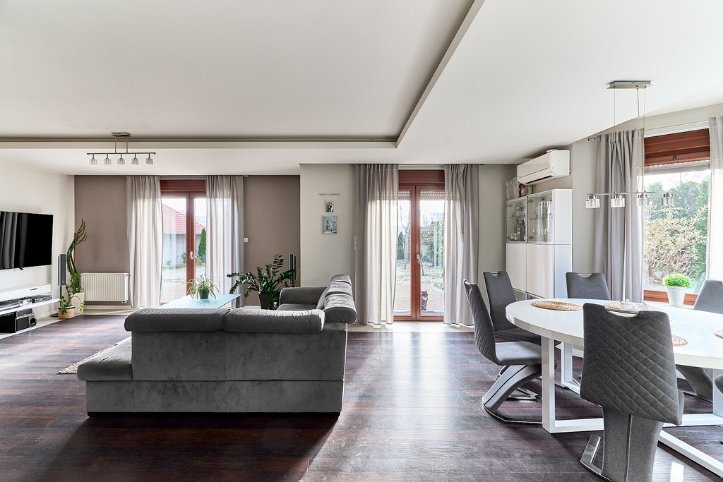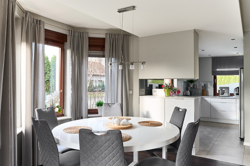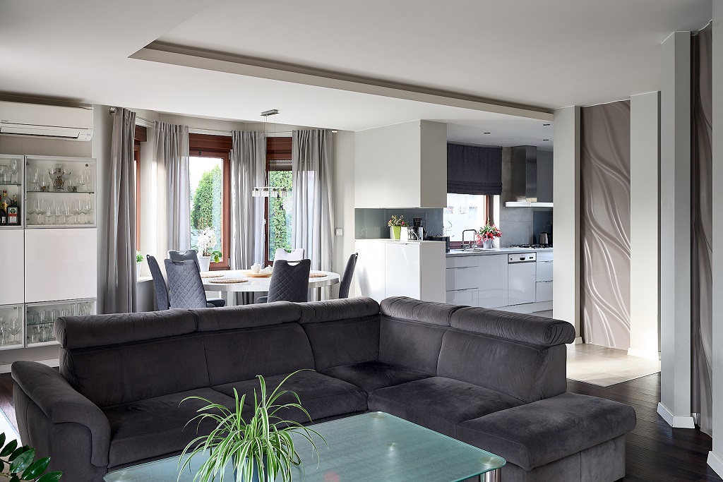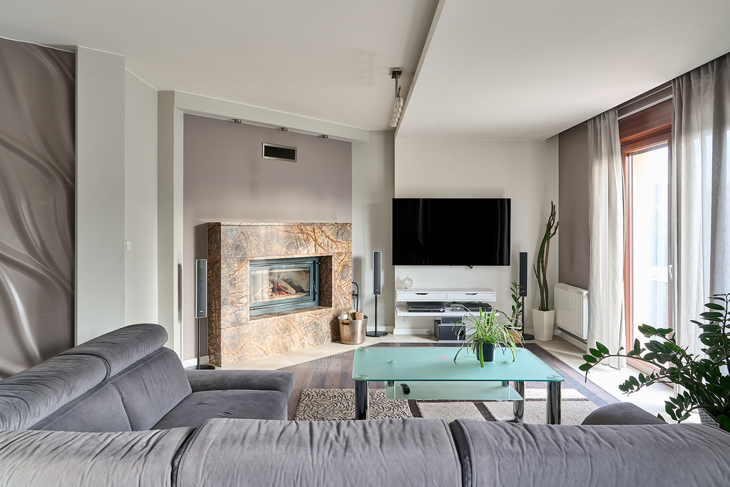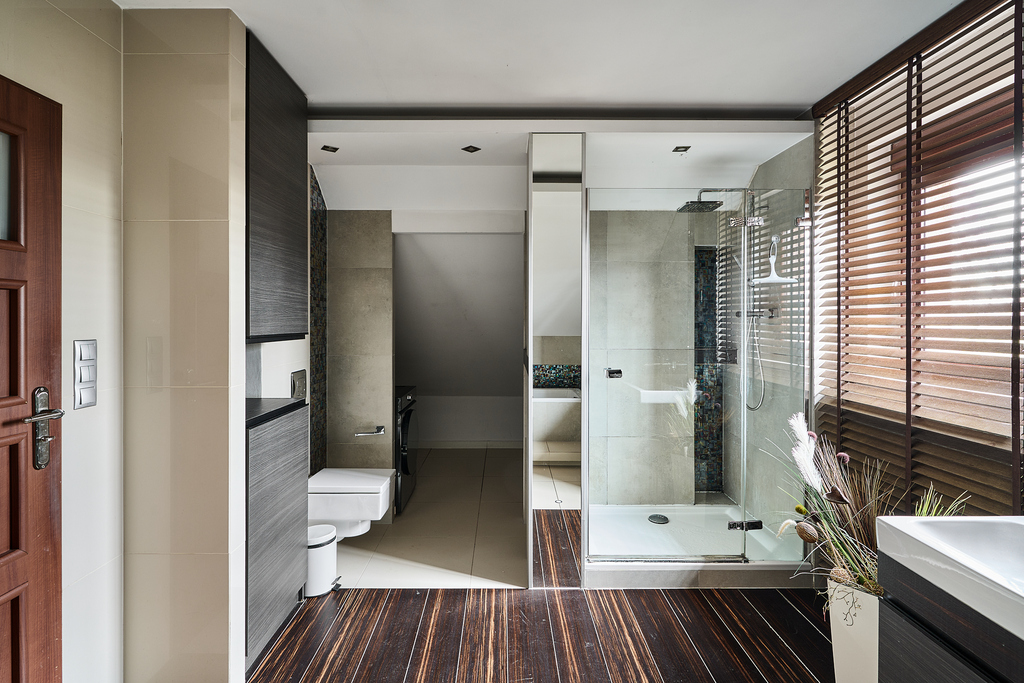 Wnętrze domu utrzymane jest w bieli, szarościach i kolorach drewna, a użyte do wykończenia materiały są wysokiej jakości. Biegi schodowe między parterem i piętrem wyłożone są drewnem bukowym, a na podłogach znajduje się panel imitujący drewno. W salonie znajduje się kominek z płaszczem wodnym rozprowadzającym ciepło po całym domu (również w niezależnym lokalu). Dodatkowo na całym parterze rozprowadzono ogrzewanie podłogowe. Okna z profili PCV imitujące drewno. W każdym oknie są zamontowane rolety zewnętrzne (duże – sterowane elektrycznie, małe – manualnie).