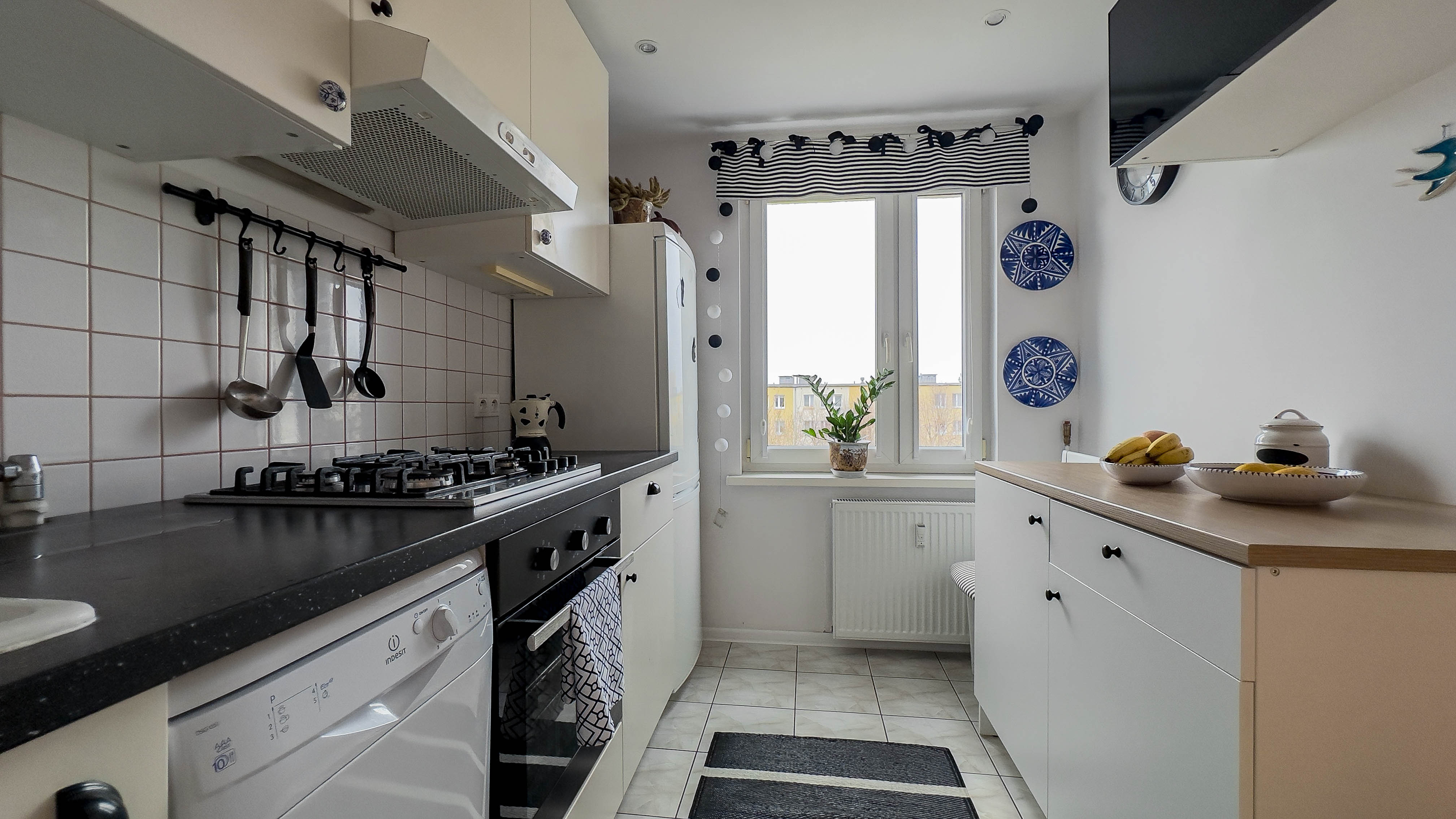 Mieszkanie bardzo zadbane i dobrze utrzymane. Na podłodze w pokojach i korytarzu jasne panele w bardzo dobrym stanie, w kuchni i łazienkach - płytki podłogowe. Ściany szpachlowane. Okna plastikowe w dobrym stanie. Kuchnia z meblami na wymiar - jasna, w bardzo dobrym stanie. Ogrzewanie w mieszkaniu miejskie.
