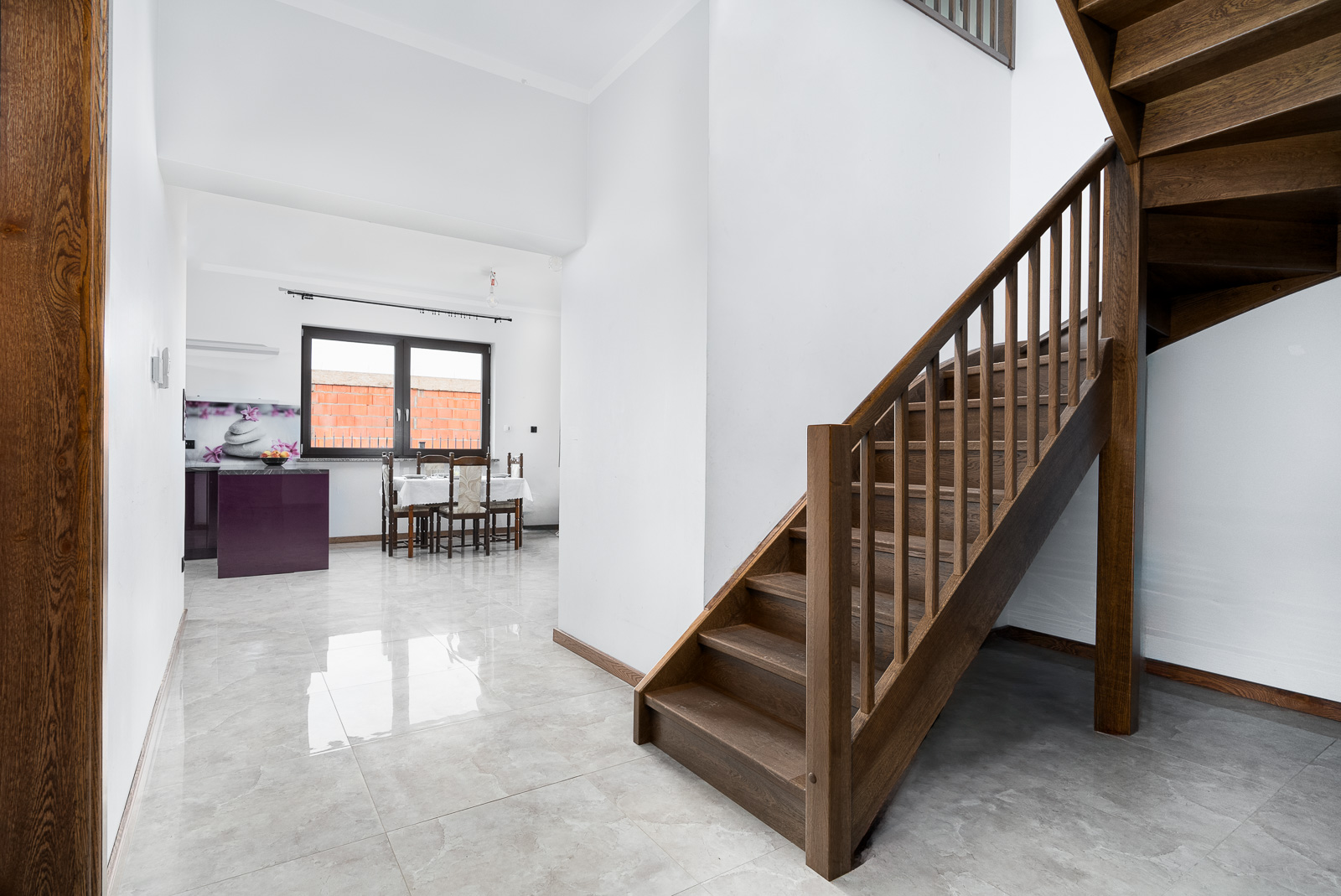 Materiały użyte do wykończenia są wysokiej jakości. Biegi schodowe między parterem, a piętrem wyłożone są drewnem, a na podłogach znajduje się wysokiej jakości jasno-popielaty gres oraz deska drewniana.