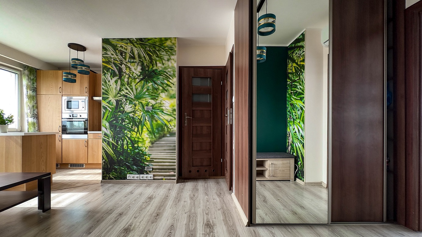 Mieszkanie jest utrzymane w wibrujących, żywych kolorach, z motywem tropikalnych elementów. Tu każde pomieszczenie emanuje energią barw.