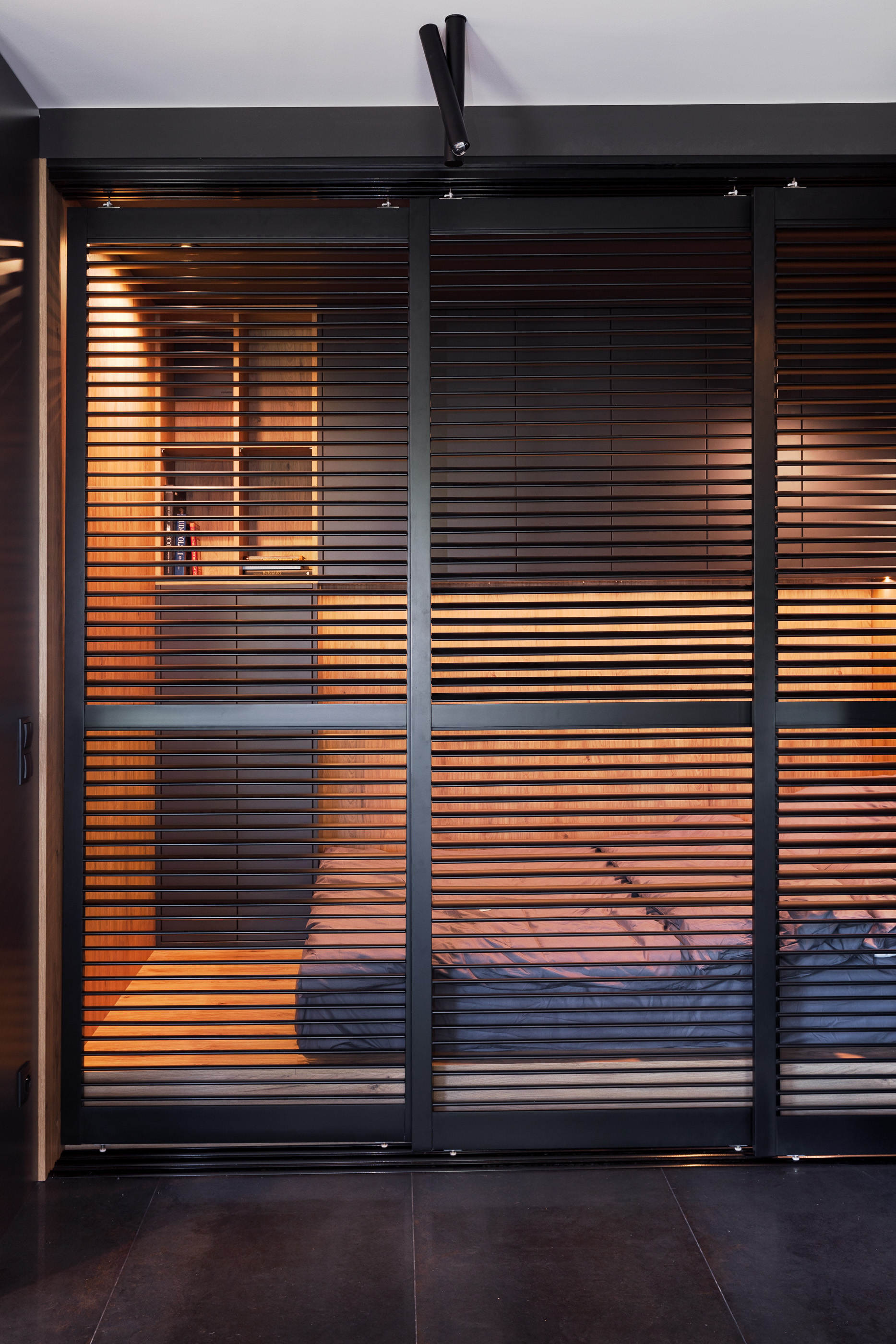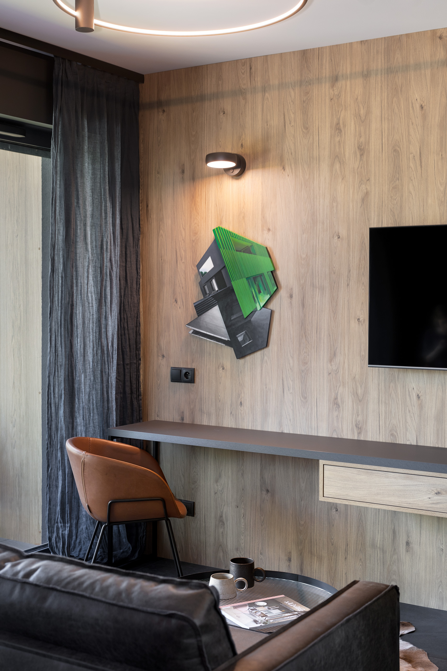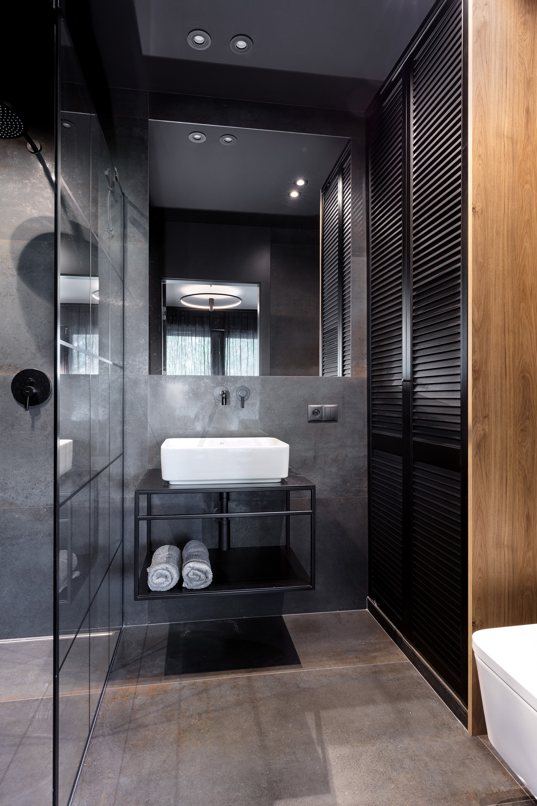 Ciemny styl kawalerki delikatnie przełamują rdzawe akcenty w postaci pasów na płytkach, tapicerki na krzesłach czy dywanu. Całość składa się na niezwykle eleganckie wnętrze.