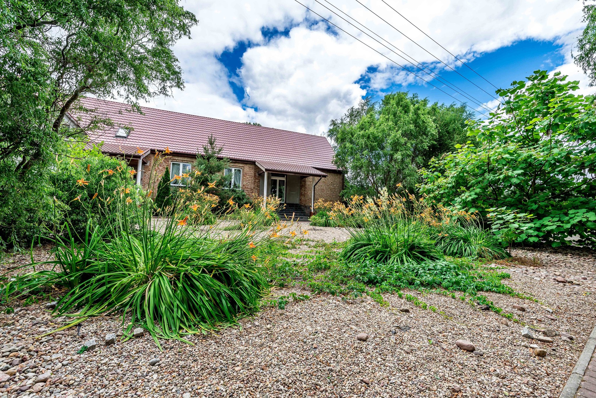 Działka narożnikowa o powierzchni 3.477 m2 zagospodarowana krzewami i drzewami ozdobnymi oraz drobną roślinnością ozdobną i brukowanymi ścieżkami.