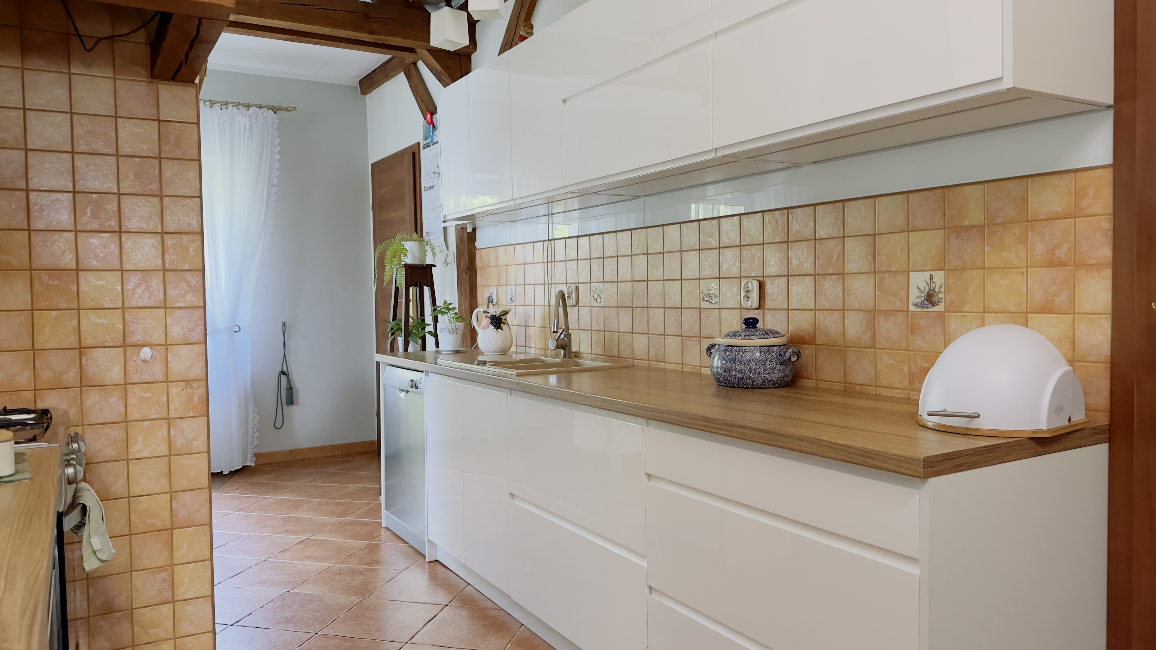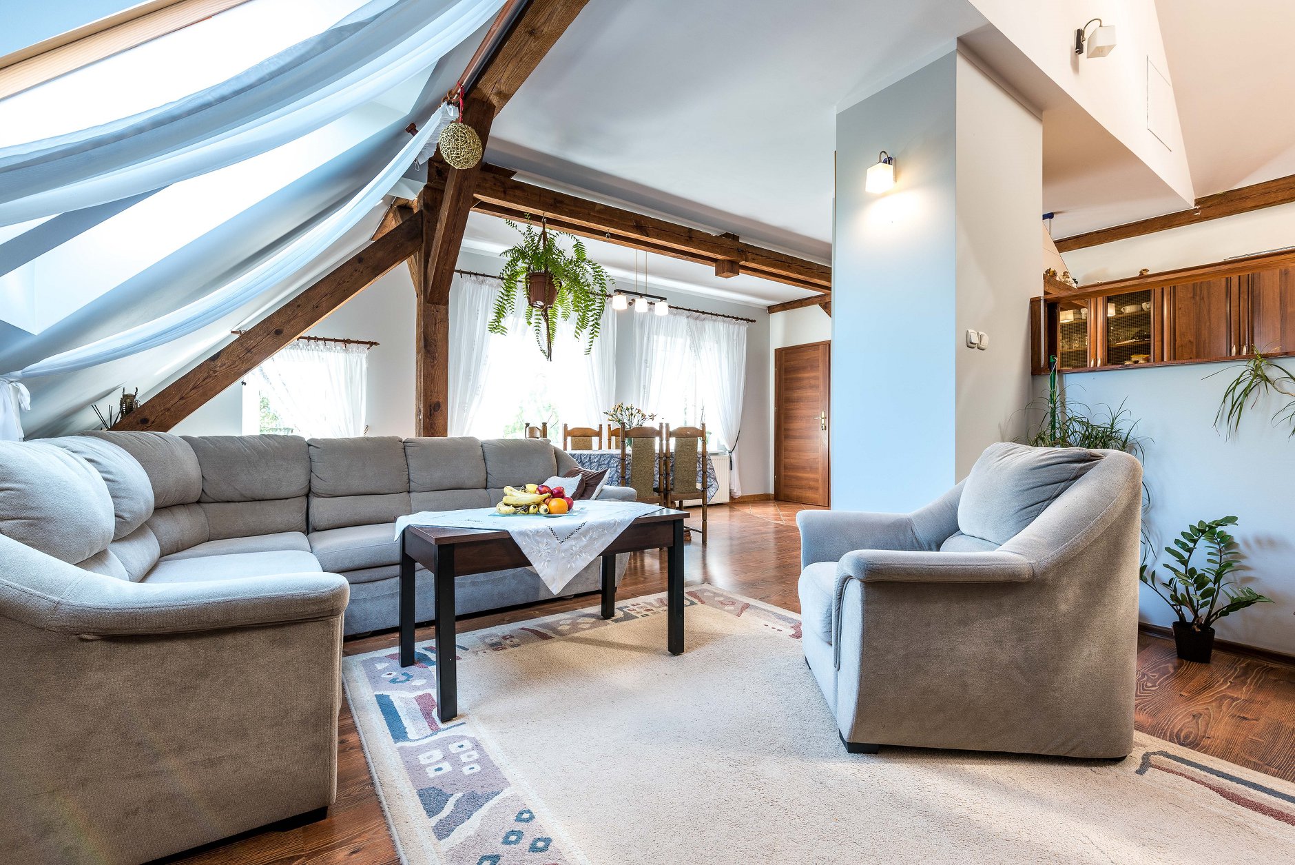 W mieszkaniu na piętrze oryginalne belki stropowe stanowiące bardzo ciekawą aranżację.