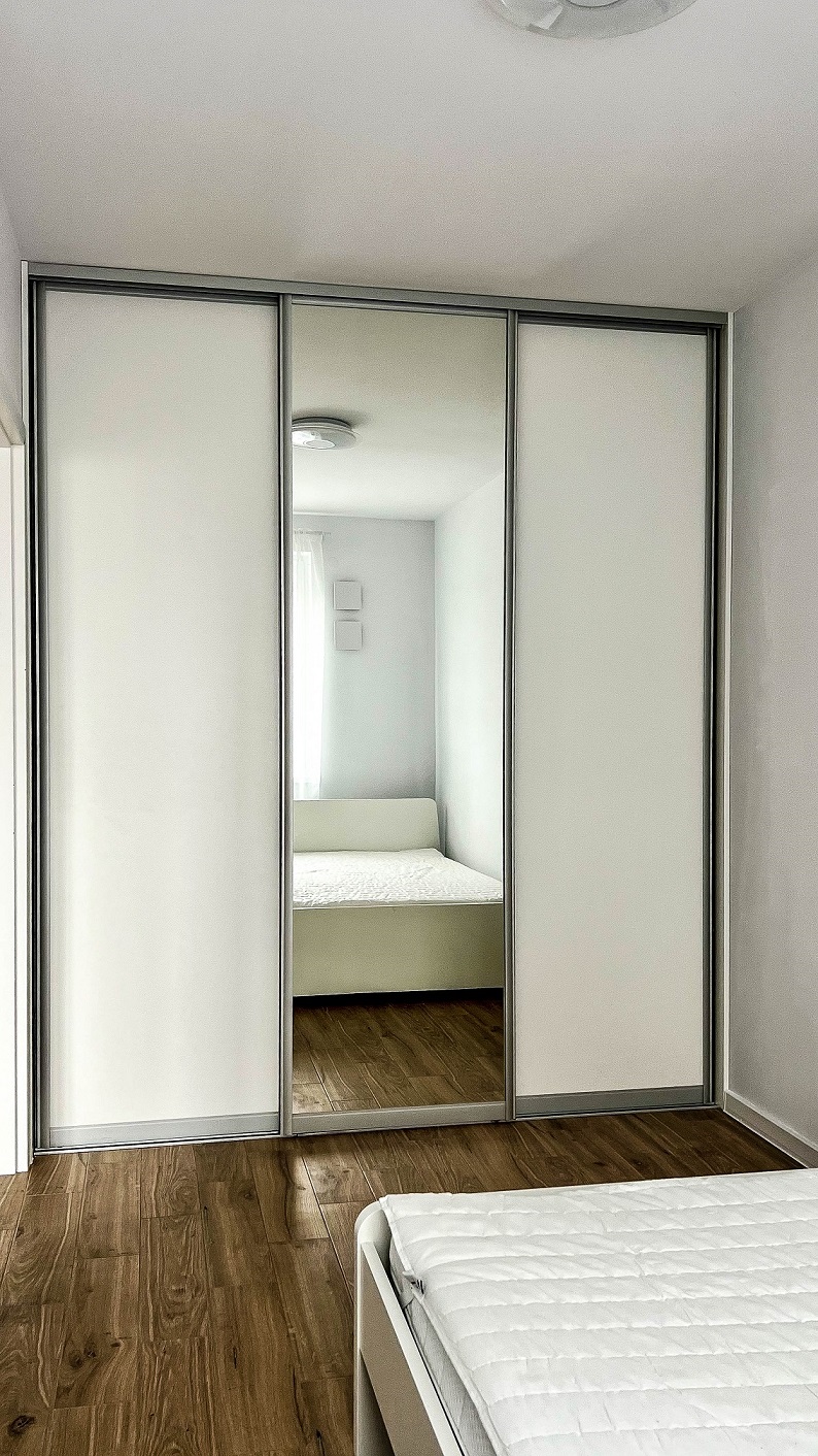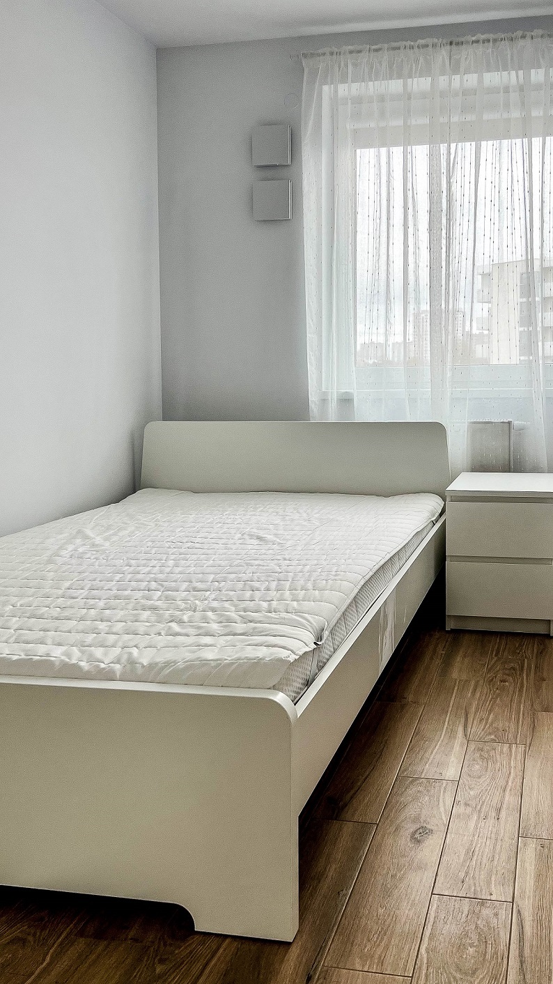 W sypialni mamy dwuosobowe łóżko, szafkę nocną, oraz dużaą przestronną szafę.