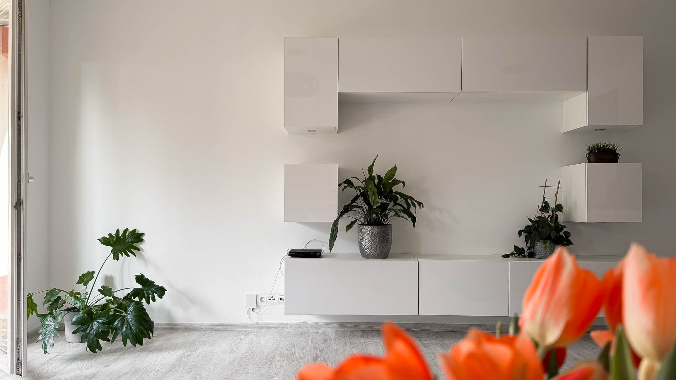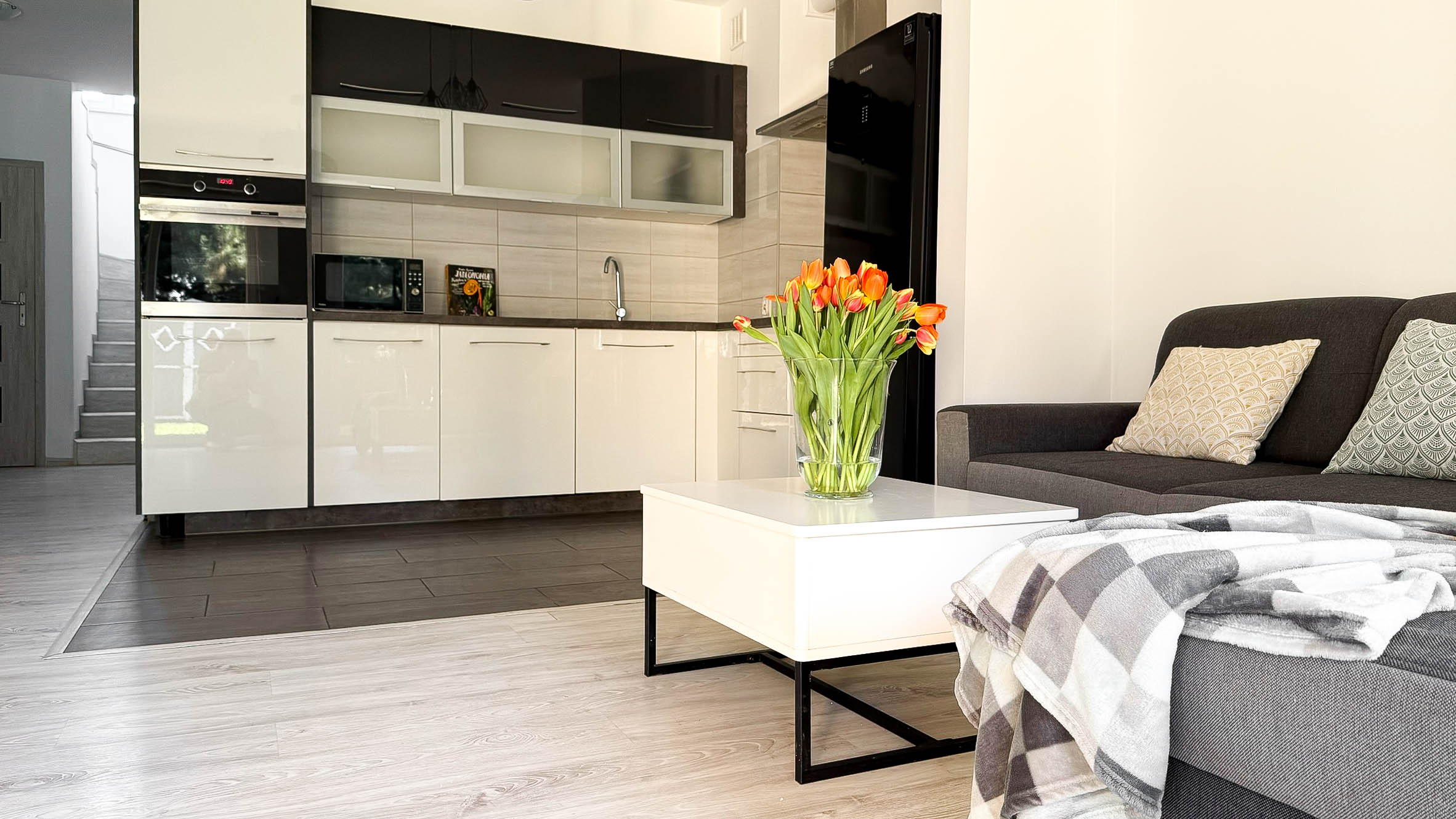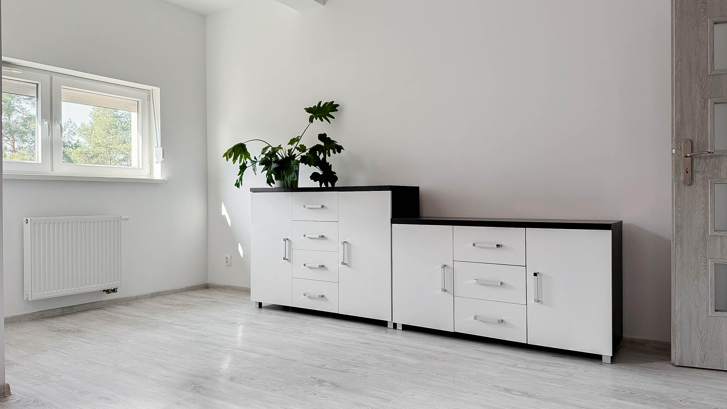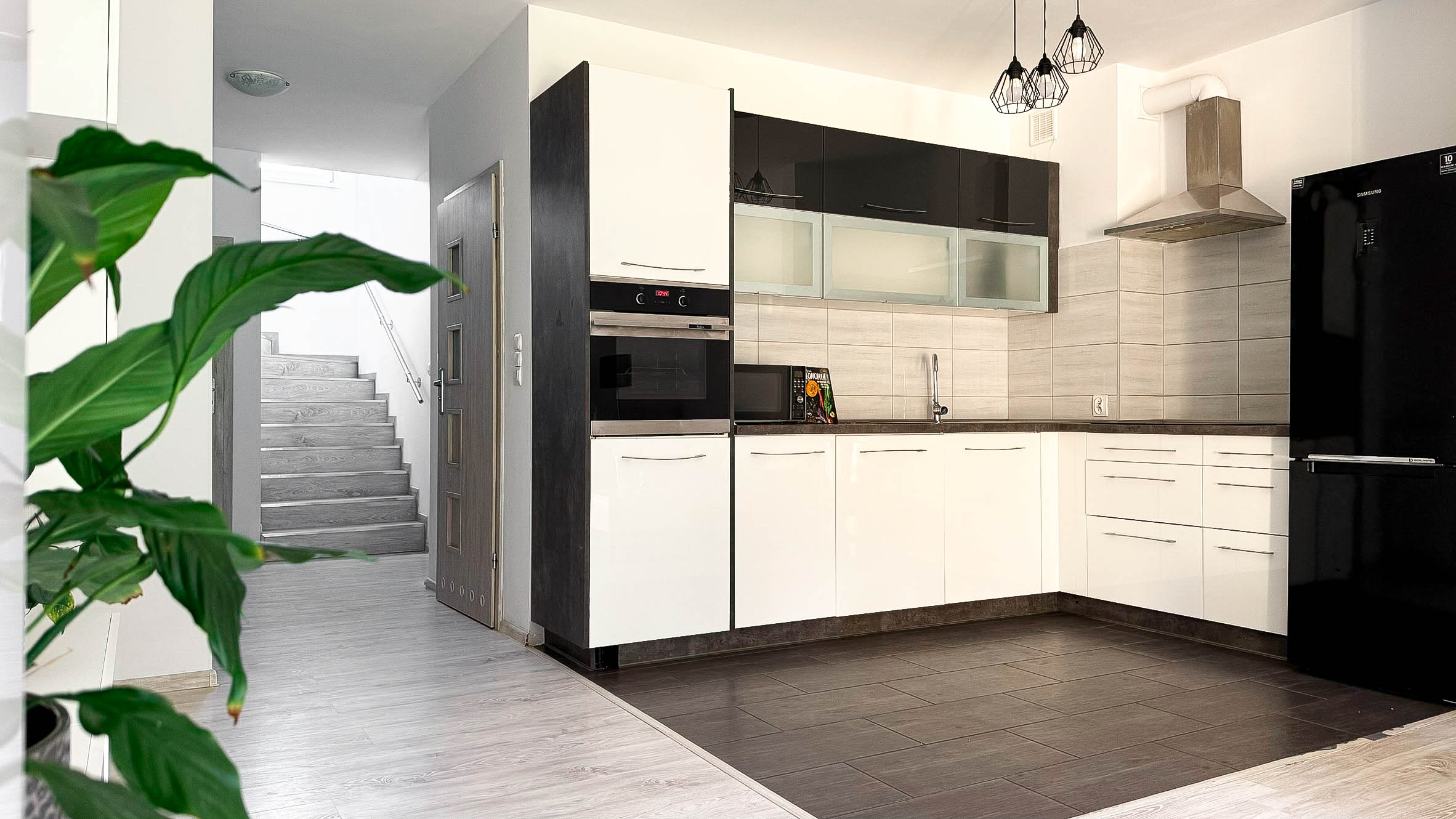 W salonie znajduje się rozkładany duży narożnik oraz szafki wiszące. Aneks kuchenny jest wyposażony w niezbędny sprzęt AGD (piekarnik, zmywarka, lodówka z zamrażarką, płyta indukcyjna). W korytarzu i wiatrołapie znajdują się duże szafy z zabudowie oraz dodatkowo pomieszczenie gospodarcze pod schodami.