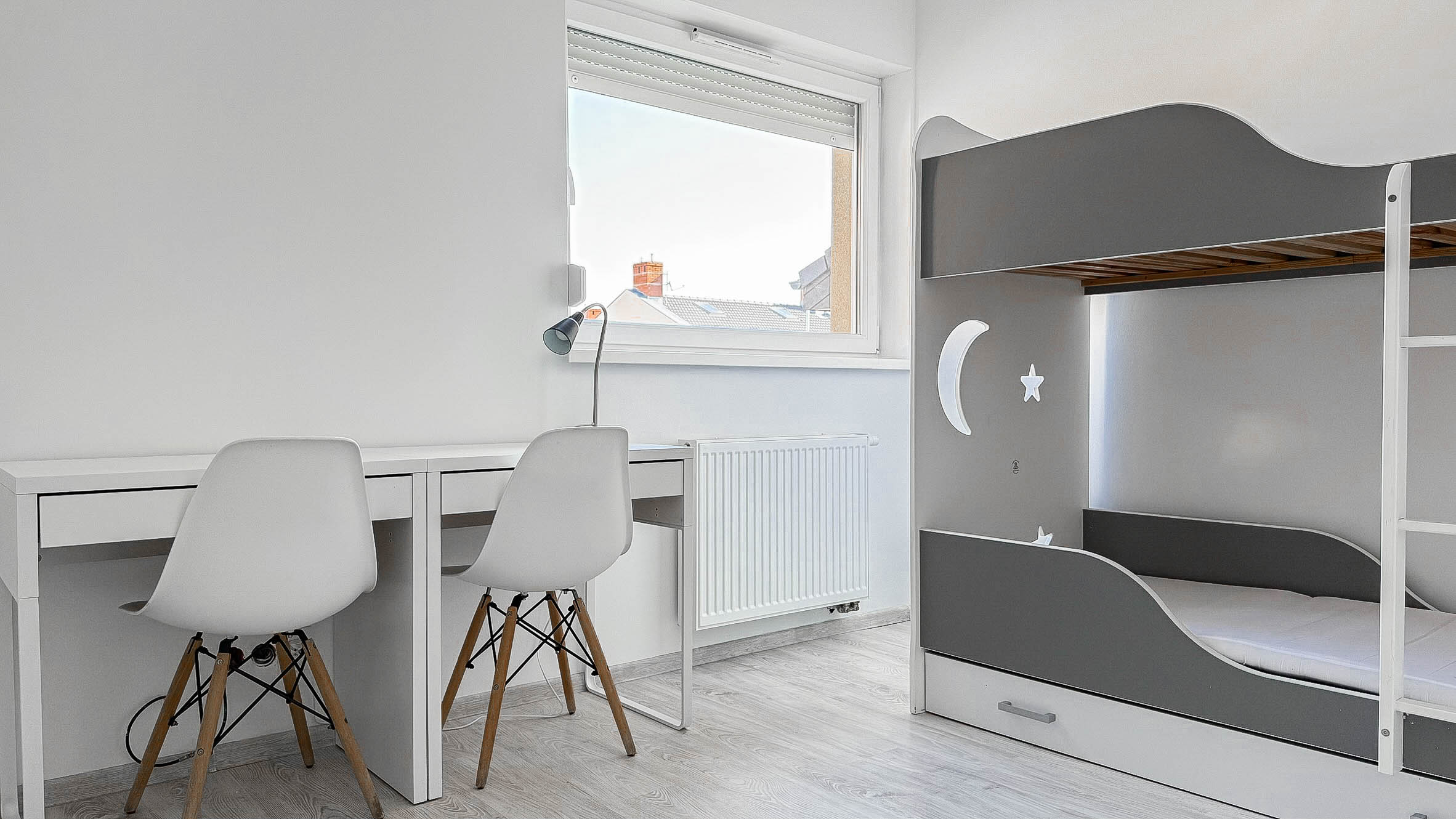 Sypialnia dziecięca wyposażona jest w łóżko piętrowe, komodę oraz dwa biurka z krzesłami.