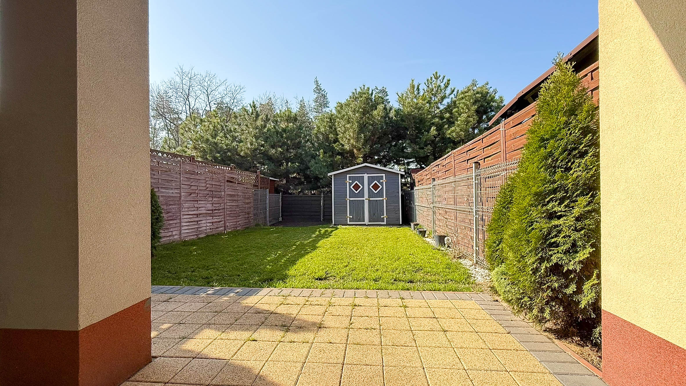 Z salonu wyjdziemy na zadbany ogród. Na ogrodzie znajduje się domek narzędziowy.