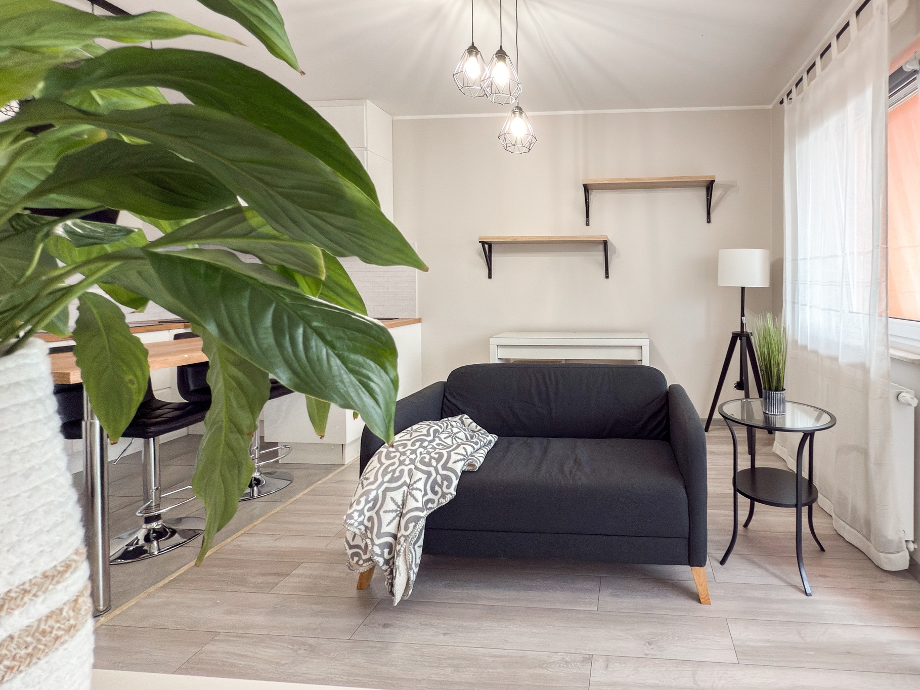 W salonie znajduje się kanapa nierozkładana kanapa, fotel, biurko do pracy, komódka.