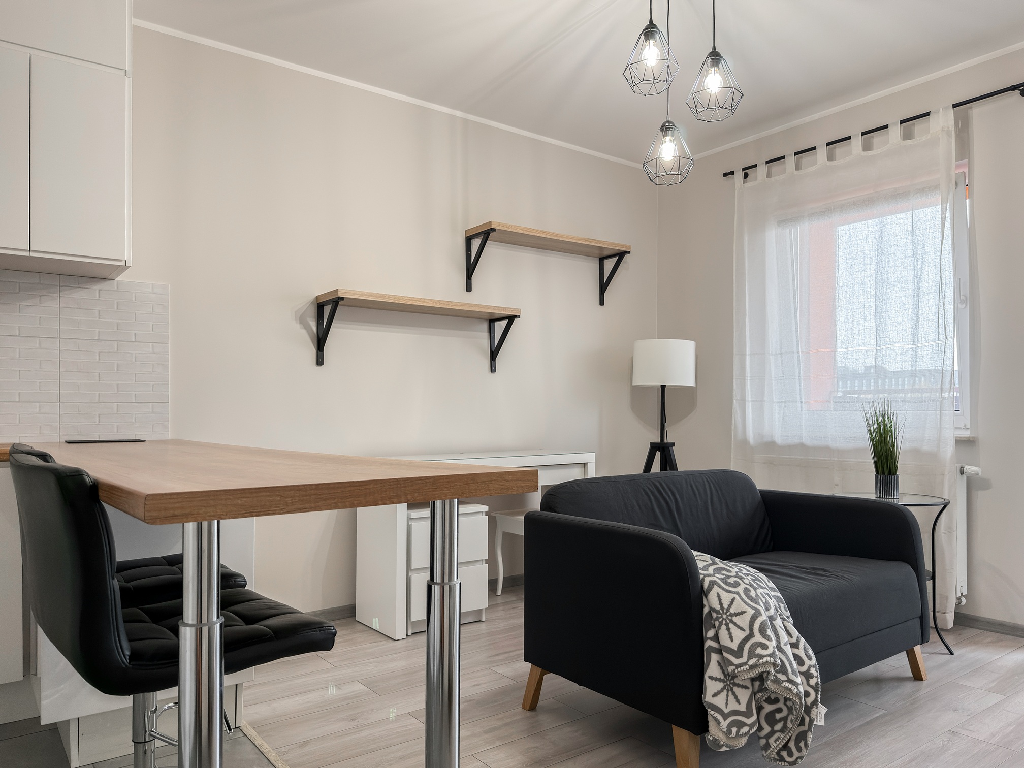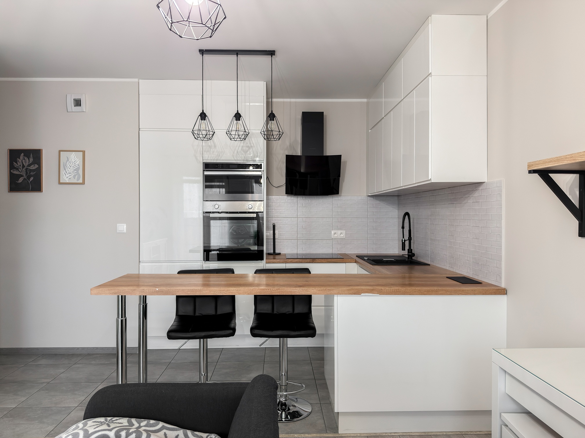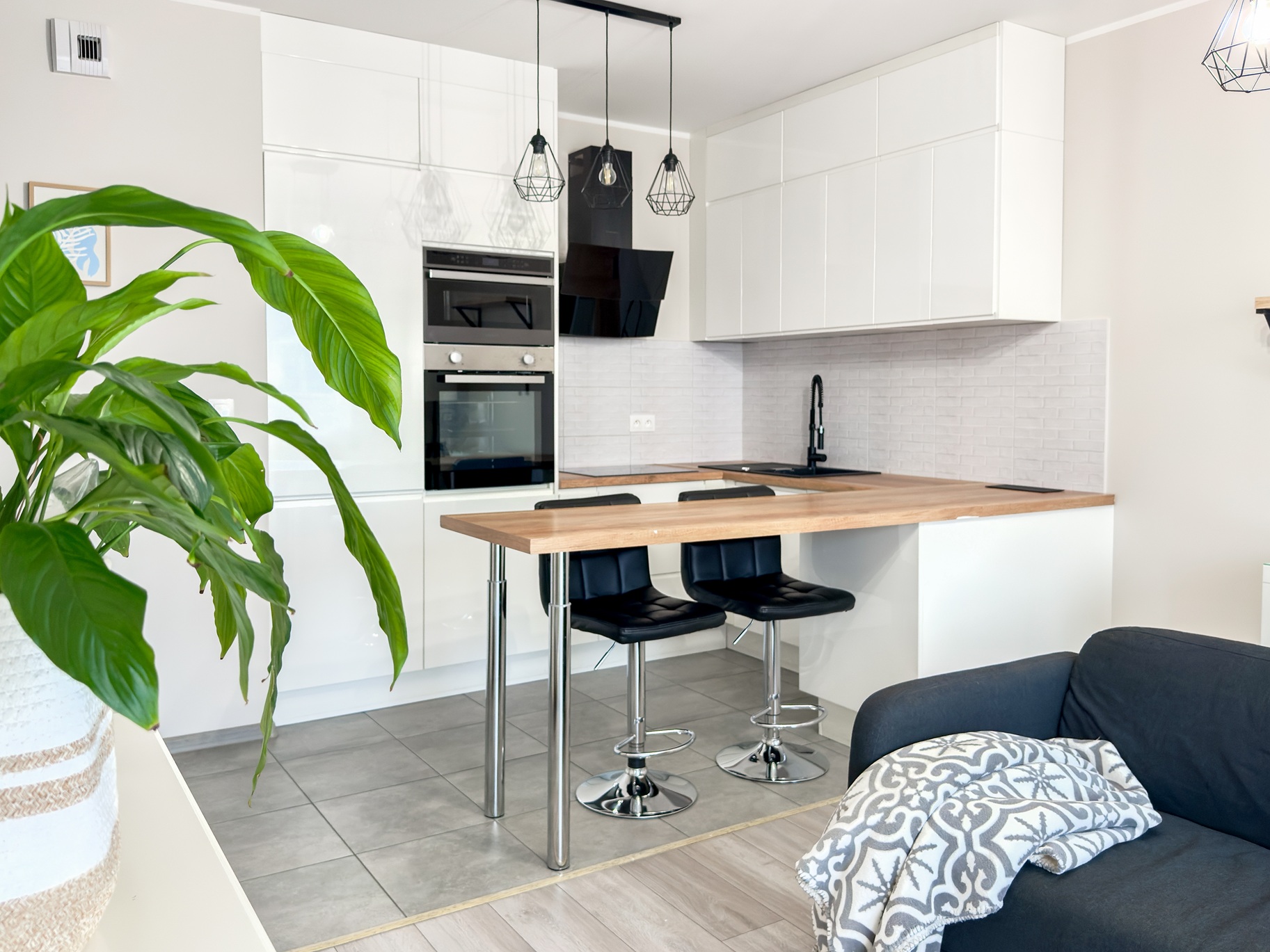 Mieszkanie jest pięknie i nowocześnie wyposażone. Wygodna kuchnia posiada duży blat roboczy, jest wyposażona w zmywarkę, lodówkę, piekarnik, mikrofalówkę i płytę indukcyjną.