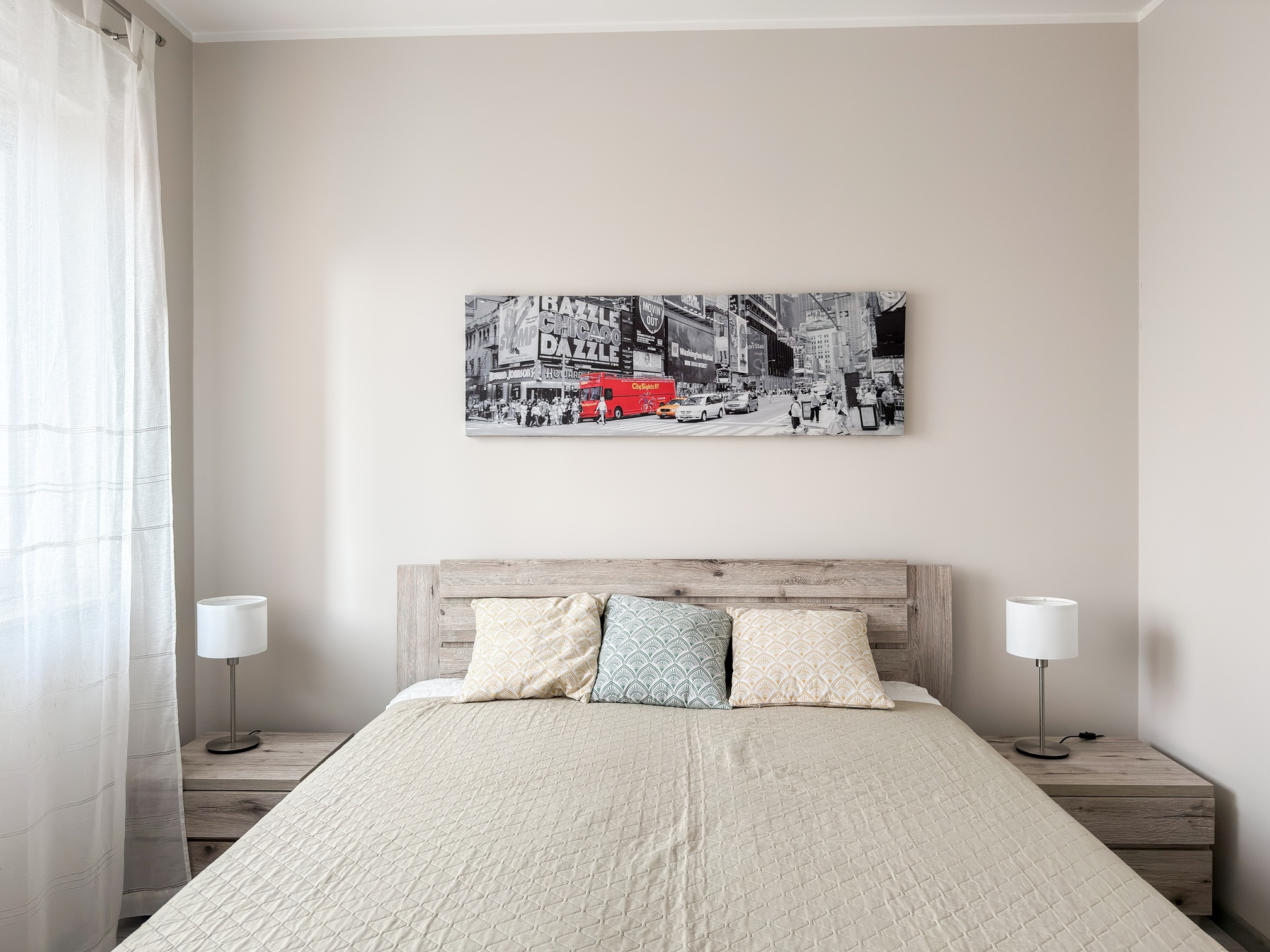 W sypialni znajduje się dwuosobowe łóżko oraz duża szafa w zabudowie.